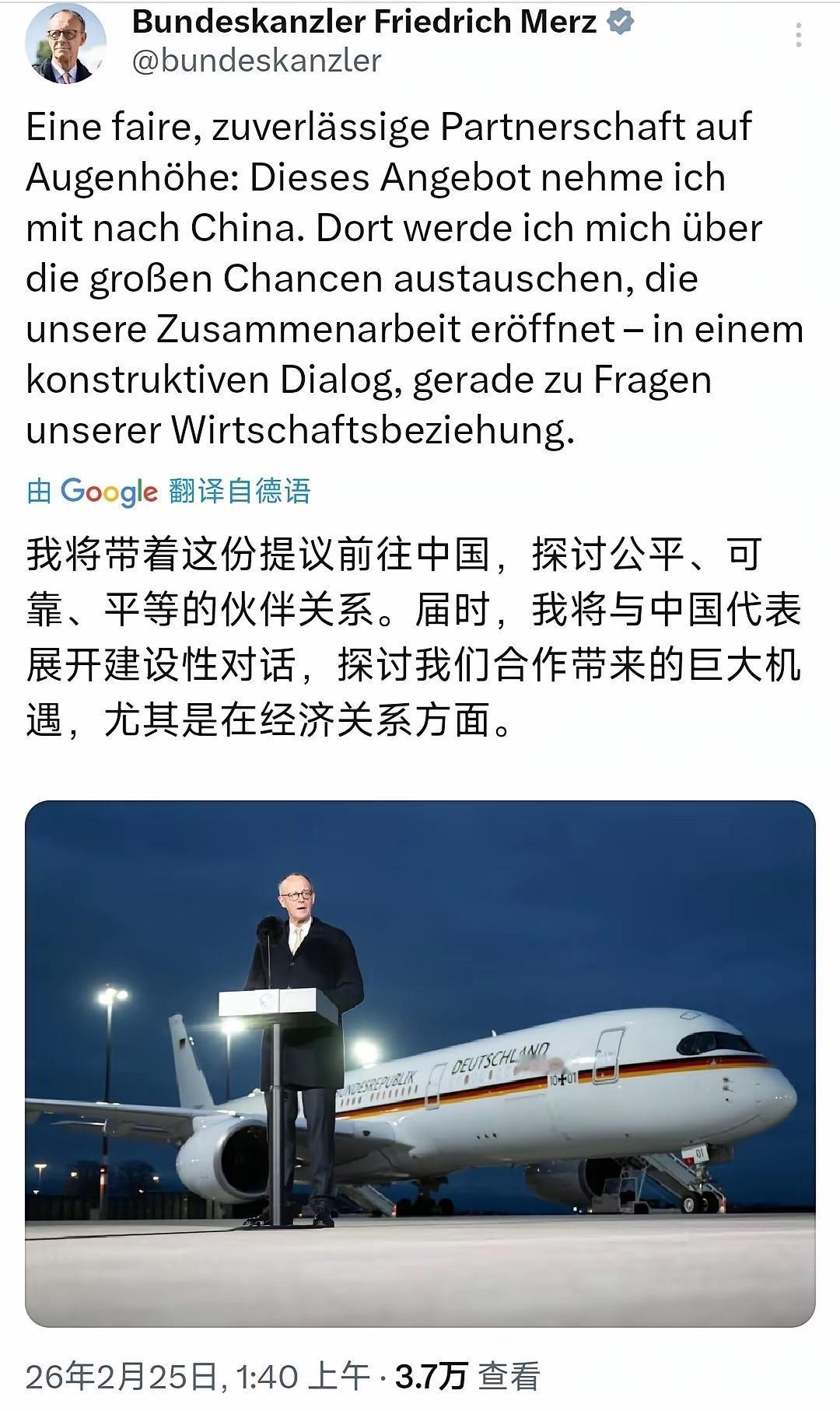 2月25日,德国总理默茨在出发前往中国之前,在柏林机场发表了简短的对华政策演说。那么默茨到底说了一些什么?对他接下来两天的访华行程,又会有什么样的期待呢? 默茨在机场的讲话,核心就一个词:务实。他上来就感谢中方在春节这个特别的日子接待他,给这次访问定了个暖色调。他明确说了,所谓“脱钩”是错的,只会伤及自身,德国经济界对合作有高度共识。这话听着舒服,但咱们得琢磨琢磨,他为什么选在现在说这个? 说白了,德国现在日子不好过。美国那边关税大棒挥得呼呼响,德国汽车对美出口暴跌近18%,传统市场萎缩得厉害。德国经济去年差点就趴窝了,现在急需找个新引擎。放眼全球,除了中国这个拥有完整产业链和庞大市场的“世界工厂+创新中心”,德国还能指望谁? 默茨这次带了个“顶配团”,拜耳、大众、西门子、阿迪达斯……德国经济的半壁江山都来了。这架势,比默克尔时代还夸张。这说明什么?说明德国商界是真急了,他们不是来旅游的,是来找订单、找合作、找活路的。默茨这次来,就是来“补课”的,他得赶紧把前任耽误的时间追回来。 行程安排也很有意思。除了北京的政治会晤,他还特意要去杭州。去干嘛?看机器人企业宇树科技。德国人现在终于放下架子了,他们意识到在人工智能、机器人这些新赛道上,中国已经跑在了前面。默茨这次来,多少有点“取经”的意思,想看看中国的创新密码到底是什么。 当然,他肯定也会提“公平竞争”,会抱怨德国对华贸易逆差。但咱们心里有数,德国现在离不开中国制造,更离不开中国市场。默茨这次来,姿态放得很低,就是想求合作、求发展。只要他带着诚意来,咱们也愿意给他这个面子,毕竟中德合作是双赢的事。 各位读者你们怎么看?欢迎在评论区讨论。