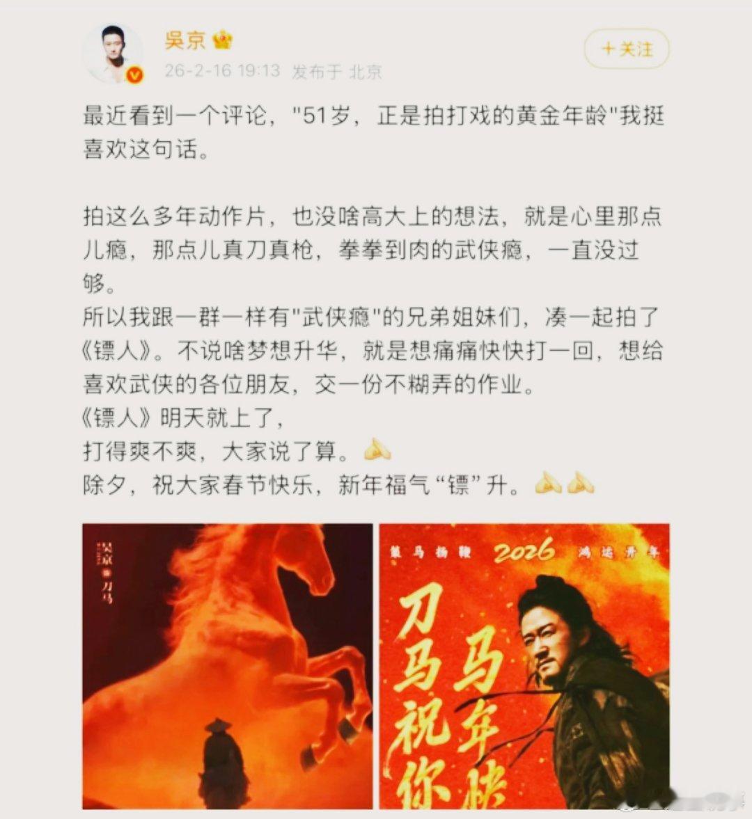 吴京好像专挑硬骨头啃 吴京从来都只走最难的路。从《战狼》扛起国产动作片,到《流浪地球》开拓科幻,再到死磕武侠《镖人》,他永远在拓荒,从不困在舒适区。用一部部作品为中国电影开路,这样的演员真的太让人敬佩。
