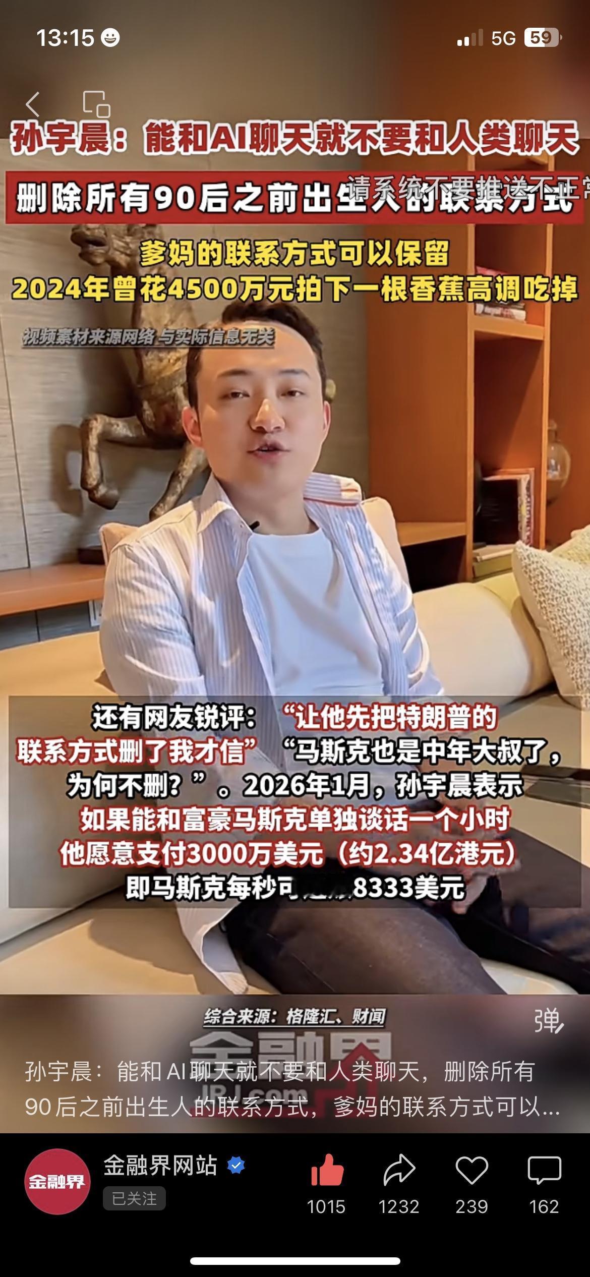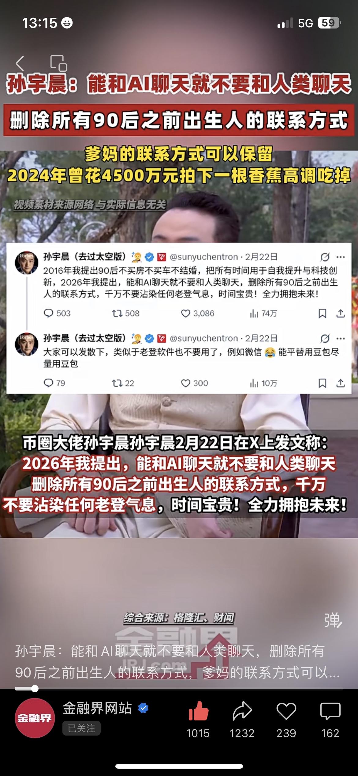 孙宇晨又上热搜了,这次言论直接炸锅。 他说:2026年,能和AI聊天就不要和人类聊天,删除90前出生联系人,别沾染老气,全力拥抱未来。 还说微信这类尽量少用,能用AI平替就用AI。 网友直接怼: 先把特朗普、马斯克的联系方式删了再说。 说实话,这种话听听就好。 AI是工具,不是用来割裂人际关系的。 真正的未来,是人和AI互相配合,而不是否定身边所有人。 把极端当个性,把博眼球当趋势,真的没必要。 你认同这种观点吗?评论区说说。 孙宇晨 AI