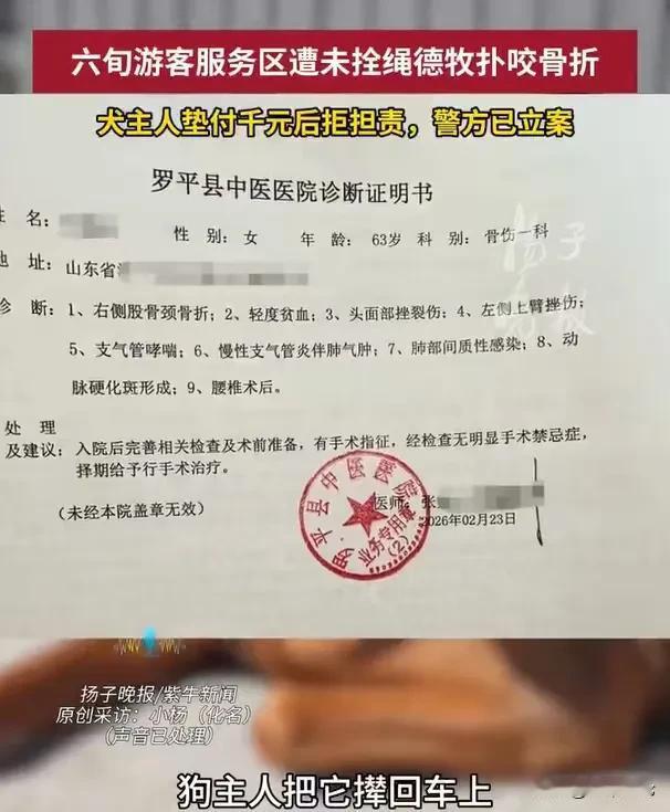 云南罗平,六旬女子在服务区休息时,被一只没有栓绳的牧羊犬,扑咬摔倒,受伤非常严重,一开始的时候,犬主人愿意全权负责,后来听说要3万左右的医疗费,他只给1000元就开车离开,并且还说是因为老人身上有味儿,狗才会扑咬她的。 一路开车奔波,小杨和丈夫,还有父母都累了,他们来到一个服务区,就打算好好休息一下。 车刚停好,小杨的父母就迫不及待地下车,散散步,活动活动筋骨,小杨和丈夫收拾一下车辆,好让父亲再上车,待得舒服一些。 就在他们整理车辆时,他们听到了母亲的惨叫声,小杨和丈夫赶紧跑过来,眼前的一幕,把小杨吓坏了。 只见她的妈妈,流了很多血,腿都动不了,躺在了地上,她的母亲才下车一会儿,怎么就变成这样了呢,她被吓到了,赶紧去把母亲扶起来。 事情为何会这么严重? 原来小杨的父母下车之后,就在车位附近散步,他们停车的位置本来就是停车场,停的车很多,不少人开了车门,下车透气散步。 小杨的母亲路过一辆车,不知道怎么回事,一辆没有关车门的车辆,突然就冲出一只牧羊犬,它的目标很明确,直径就扑向了小杨的母亲。 还好,这一次是有惊无险,犬的主人,发现自己的狗想扑咬别人,就赶紧把狗撵回车上,但是他们没有对此事引起重视,根本就没有关车门。 这只牧羊犬根本就不想放过小杨的母亲,又冲下车,扑了过来,对小杨的母亲进行撕咬,一阵撕咬下,小杨的母亲受伤严重,倒在地上,流了很多血。 小杨看到母亲流了这么多血,吓得是赶紧报了警,也叫了急救车,这才知道为什么这只牧羊犬,为何要咬她的母亲。 在民警的询问下,犬的主人说,是因为老人身上有特殊的味道,这才被他家的狗扑咬的。 这个犬的主人这么一说,小杨这才想起来自己车上也带了两只狗,但是这两只狗并没有下车,母亲没有带狗下车散步,在这种情况下也被这只牧羊犬咬,小杨当然要追究犬主人的责任。 一开始的时候,犬主人确实愿意承担责任,也安排自己的女儿陪同老人去当地医院。 但老人受伤实在太严重了,左侧股骨颈骨裂,头面部受伤严重,上臂也受伤了,由于小杨的母亲年龄大,并且有过其他的手术史,所以这一次,小杨母亲要做的手术的时间特别的长,经历了三个小时。 因为小杨的母亲受伤严重。小杨一心只想好好照顾母亲,并没有在意犬主人会怎么想,因为他说过会承担所有的损失和医药费,小杨信了。 她不知道的是,一个犬主人偷偷地打听了一下,小杨的母亲的医药费大概是3万左右,一听要这么多钱,他们态度就变了。 他们怎么也没想到,老人只是被狗咬了一下就要这么多钱,他们可不愿意承担这么多的费用。 小杨想着母亲要花这么多钱,对方也不容易,能走医保就走医保,少花一些钱。 可是医生告诉她,老人是被狗咬的,应当由狗主人负责。如果有第三方负责人,在这种情况下也要走医保,那就是骗保。 既然医生这么说,她只好把医生的话告诉犬主人,犬主人一看要赔这么多钱,当时就不愿意了,他大声说道:“如果不能走医保,那么我一分钱都不会拿!” 一看犬主人不想承担责任,小杨也是十分的气愤,马上就报了警。 小杨表示,她会尽量地给母亲走医保报销,但是犬主人需要先支付剩下的手术费,和2万元的后续治疗费,但是犬主人不同意。 然后他只是转了1000元,就开车走了,路上他在电话里扬言道:“我一分钱都没有,你想怎么样就怎么样!” 看到对方的态度,小杨真的很气愤,更是担心后面联系不上这个犬主人。 更让她揪心的是,他们已经花了1万多元,母亲情况依然很不乐观。 医生说就算老人做了手术,她的脚也可能会出现长短不一的情况,也就是她的母亲可能会瘸了。 母亲已经60岁了,这么大年纪,遭受这个罪,她真的很难受,更何况做完手术之后,母亲还有很长一段的恢复期,车都坐不了,他们一家人是从山东来到这里游玩的,现在都得留下来陪母亲。 发生这样的事情,犬主人却不愿意承担责任,一家人都气愤。 发生这样的事情,犬主人肯定是要负责任的,他跑也没有用。 《民法典》第1245条规定:饲养的动物造成他人损害的,动物饲养人或者管理人应当承担侵权责任。 发生这种情况,小杨可以要求犬主人全权负责。 那么你对这样的事情有何看法呢?小杨为化名