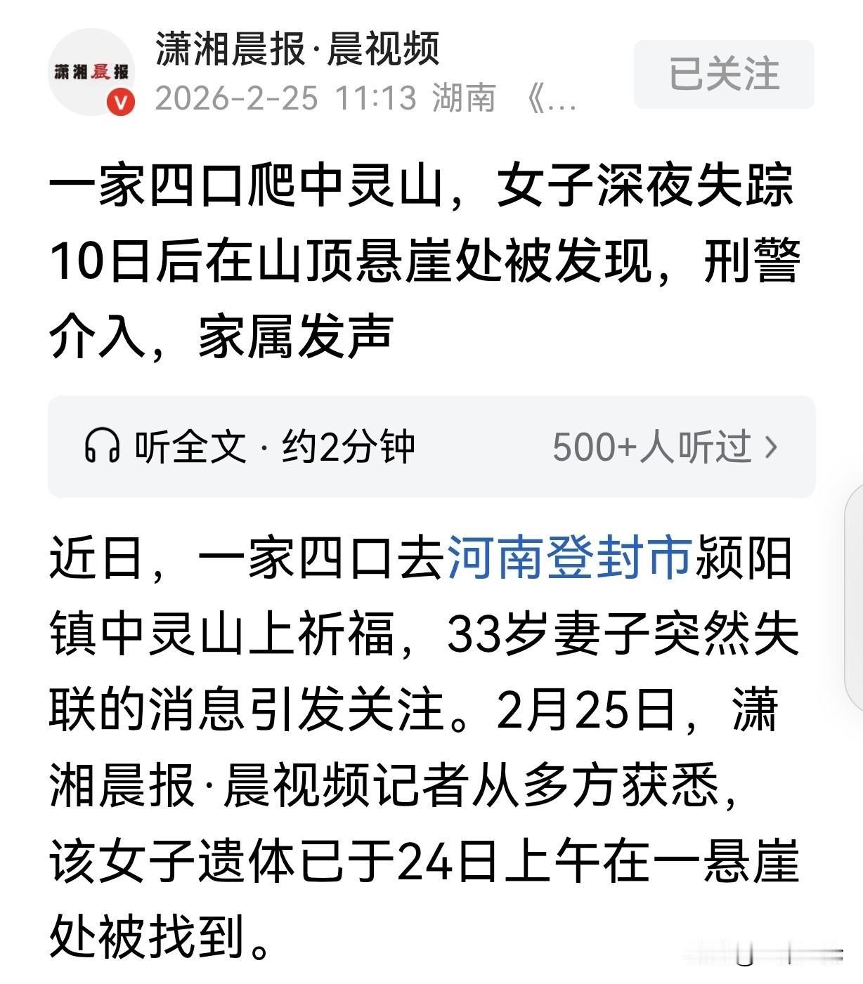 河南登封,一男子带着33岁的妻子,还有2个10岁和8岁的孩子,从重庆来中灵山祈福,妻子却深夜失踪,尸体10天后在山顶悬崖被发现,奇怪的是,妻子爬山时,竟然穿着高跟鞋,还有粉色睡裤,据男子说,妻子走丢时,神情处在恐惧状态,说话也颠三倒四。网友一致认为这个男子很可疑,妻子可能是另一个版本“消失的她”,民宿老板一番话,让事情变得扑朔迷离。 2026年2月14日,一重庆男子带着他33岁的妻子,还有2个10岁和8岁的孩子,千里迢迢来到河南中灵山祈福。 他们一家四口,是晚上开始爬山的,到了10点多,男子发现妻子不见了,赶紧报了警。 警方和消防员展开寻找和营救,附近的村民也加入进来。 男子也没闲着,他发布了寻人启事,字里行间心急如焚。 可是,寻人启事有些蹊跷,大家爬山,一般都是大白天,晚上瞎灯瞎火,伸手不见五指,走平路都深一脚浅一脚,何况蜿蜒崎岖的山路,而且,还带着2个年幼的孩子,这不符合常理。 而且,据寻人启事描述,妻子走丢时,穿着黑色高粗跟鞋,粉色睡裤,爬山即使穿运动鞋,都累的气喘吁吁,谁会穿高跟鞋?不但累,如果走不稳,一失足就成千古恨了。 而且男子说,他妻子走丢时,神情处在恐惧状态,说话表达不清楚,这让人怀疑,男子的妻子可能精神方面不太正常,这就让人浮想联翩了。 经过10天的寻找,2月24日上午,男子妻子的尸体,在一悬崖处被找到。 有人怀疑,男子的妻子是他杀,而这个丈夫嫌隙很大,毕竟在表述中,这个妻子是言语不清,不能和人正常交流,估计头脑也不灵光,灵光的会穿高跟鞋爬山吗?也可能她丈夫有意安排的鞋让她穿?就为了她一脚踩空出点意外。 如果和这样的女人一起生活,可能对男人来说,非常累,慢慢的就有想法了,一了百了。 而2个孩子可能就是掩人耳目的,到时找个借口支开,把妻子搞下去,他俩还能当证人,毕竟孩子还小,是无法不相信父亲的说法和理由的。 同时,2月25日,中灵山一民宿老板,也证实,他在2月14日晚,该在大风口的位置,遇见男子和他的2个孩子,没见到他妻子,民宿老板当时还问男子是否坐车?被他拒绝了。 后来,民宿老板也参与对男子妻子的救援,在他看来,中灵山没怎么开发,还处于原生状态,而男子的妻子,出事的地方是最山顶的位置。 男子的妻子即使健步如飞,也得2个小时到山顶,何况她穿着高跟鞋,走路快不了,得3-4小时。 所以,民宿老板想不明白,男子的妻子在精神状态不好的情况下,是怎么走到山顶的? 到底是一场意外,还是蓄谋已久的他杀,目前案件正在侦破中,让我们拭目以待。 有人说,首先男子的妻子为什么会恐惧?其次,怎么会去到人迹罕至的地方?有没有买高额保险?有没有这个女的签名的大额借款? 还有人说,推断非正常死亡的可能性大,她老公的嫌疑重大!还有另外一种可能,是和丈夫吵架了,生气走出去。气头上丈夫也不找,等时间久了,觉得不对劲了再找,就找不到了。 这件事之所以让大家议论纷纷,就是因为细节处处处透着反常。 好好的祈福,非要半夜带着俩孩子爬没开发的野山,这本身就不合逻辑。再加上穿高跟鞋爬山、妻子神情恐惧这些疑点,任谁都会往坏处想。 民宿老板的证词更是给这件事添了一笔迷雾。深夜只见到男子和孩子,妻子却不见踪影,男子还拒绝坐车,实在让人想不通。 如果妻子真的精神状态不好,一个人怎么能在黑灯瞎火里穿高跟鞋走几小时到山顶悬崖?这些矛盾的地方,丈夫的解释显然站不住脚。 网友们的怀疑不是空穴来风,毕竟“消失的她”在前,类似的剧情很容易让人共情。 当然,现在一切还只是猜测,真相得等警方调查清楚。但这件事也提醒大家,夫妻之间有矛盾一定要好好沟通,任何时候都不能动歪心思。 同时也希望警方能尽快查清真相,给死者一个交代,也让公众放下疑虑。 《刑事诉讼法》第112条规定,公安机关对于报案、控告、举报和自首的材料,应当按照管辖范围,迅速进行审查,认为有犯罪事实需要追究刑事责任的时候,应当立案;认为没有犯罪事实,或者犯罪事实显著轻微,不需要追究刑事责任的时候,不予立案。 在此案例中,案件存在多处疑点,符合立案侦查条件。警方需通过调查取证,确定死亡原因及是否存在犯罪事实,若确认他杀,将依法追究嫌疑人刑事责任,维护法律公正。 对于这件事,你怎么看? 欢迎关注@一案一论