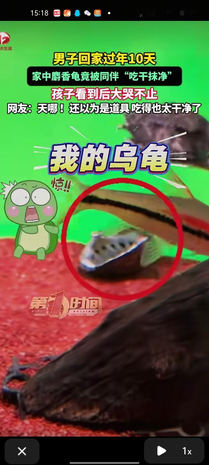 2月22日,吉林长春。网友发视频称,男子回家过年十天,家里的麝香龟被同伴“吃干抹净”,孩子看到乌龟壳后大哭不止。 当事人田先生介绍,这只龟养了一年多,缸里有其他三只小乌龟,还有十几二十条鱼,孩子对乌龟产生感情。