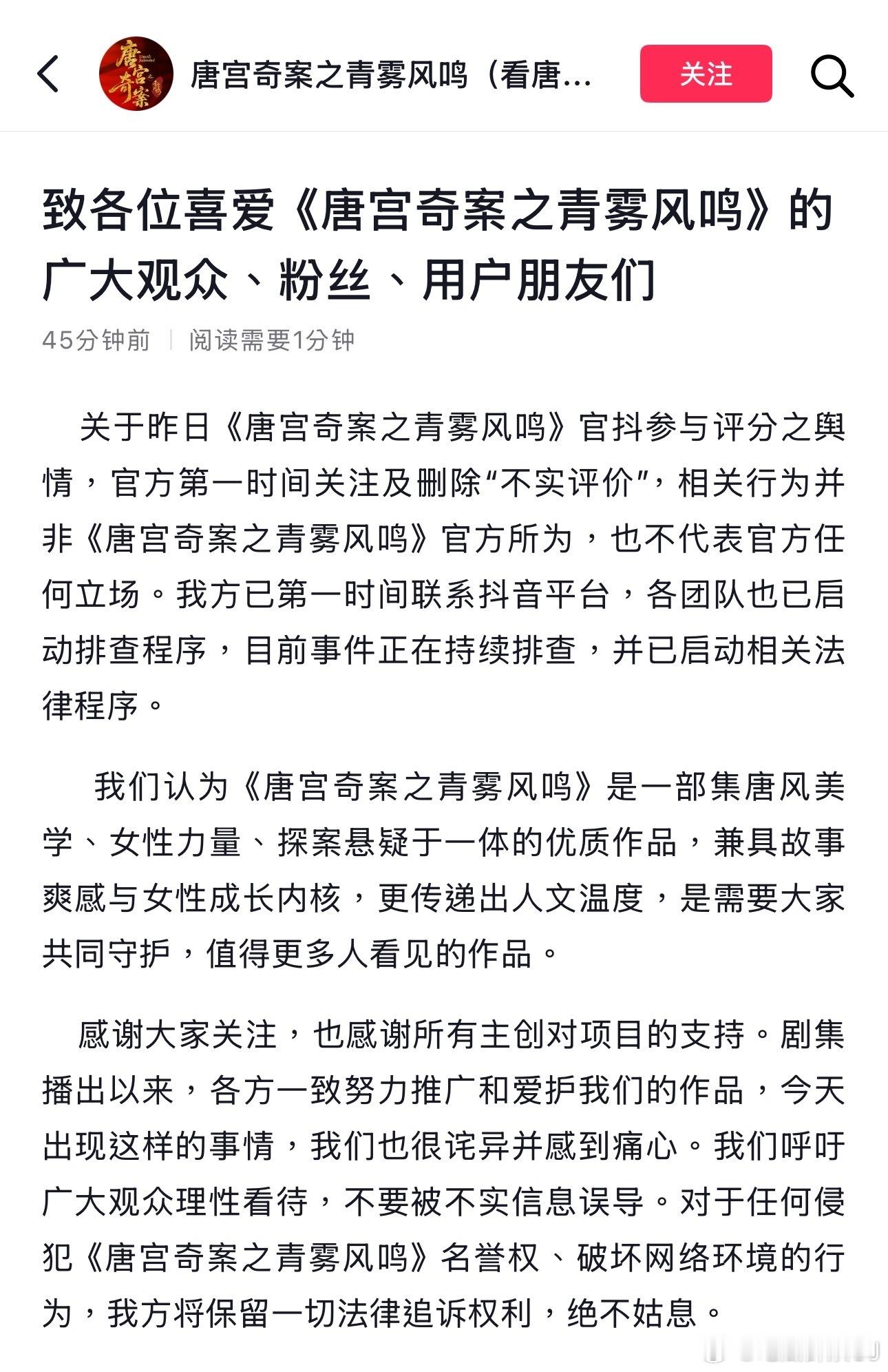 刚刚唐宫奇案官抖又就此事做了回应,说一星低分不是他们打的,也不代表官方立场,正在联系抖平台进行排查。