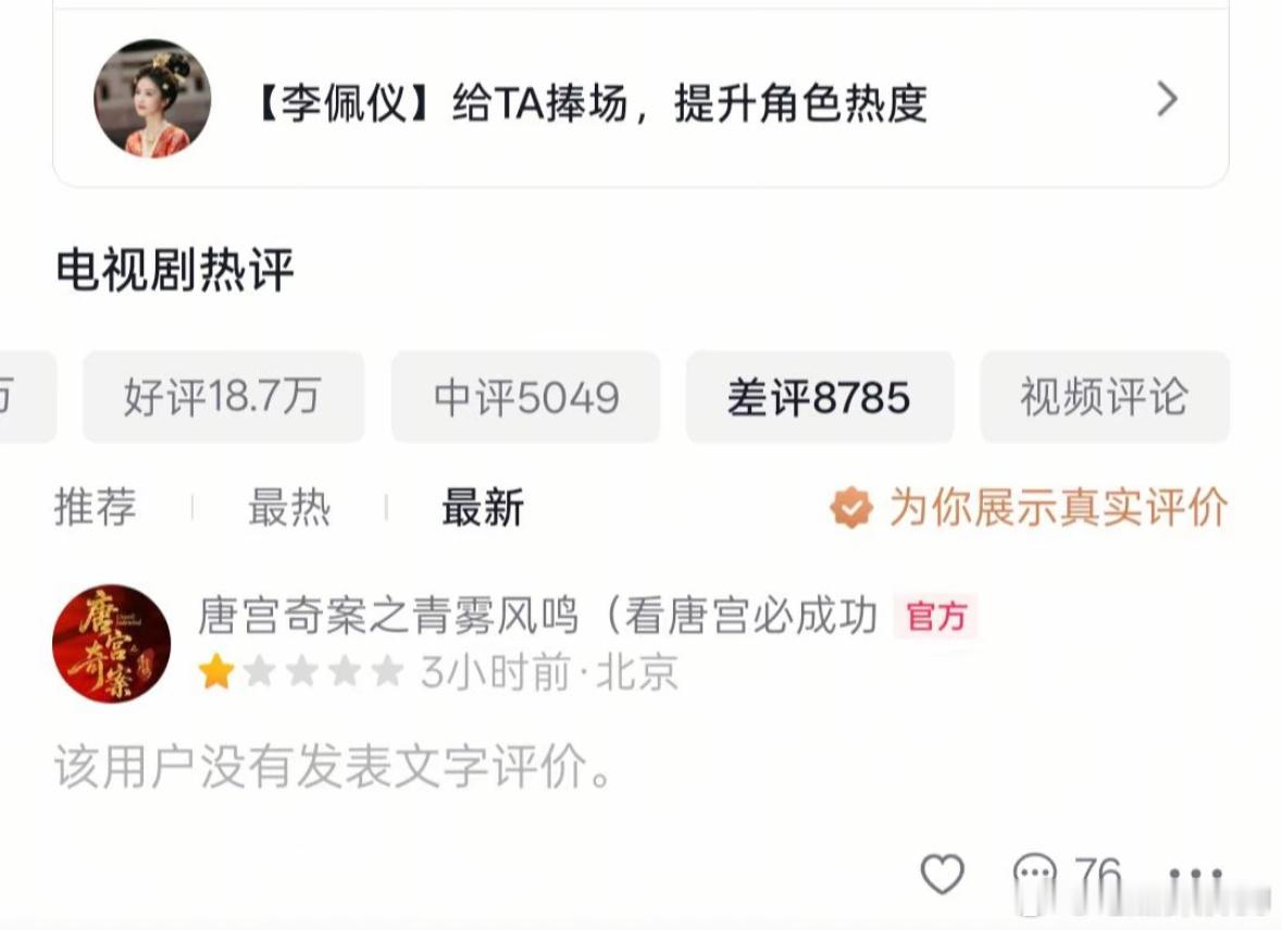 唐宫奇案官抖账号被发现自己抖给作品打一星差评,截图满天飞后事情闹上热搜,主演粉丝都在维权+质问。
