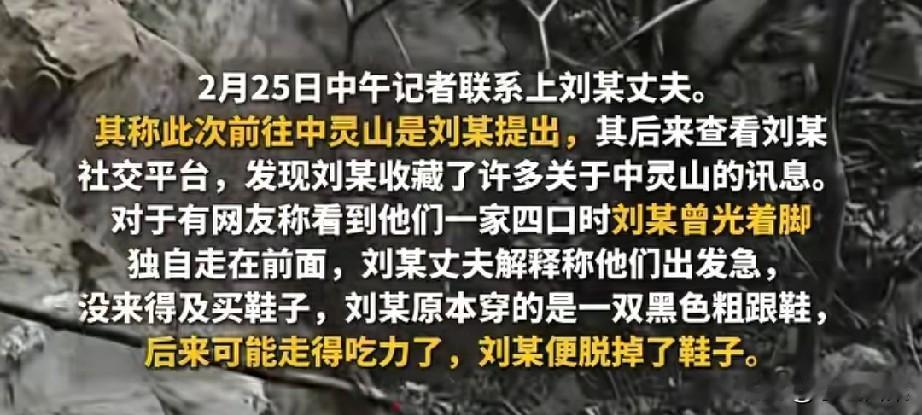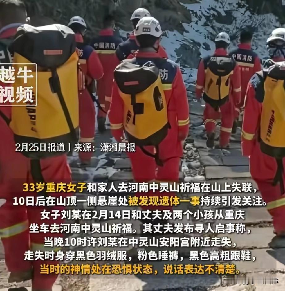 太奇怪了!33岁重庆女子刘美,与家人在河南爬山失联后死亡,有人看她光脚上山,还穿着睡裤。种种迹象表明,此事或许不简单。 刘美是2月14日同丈夫及两个孩子,一起坐车从重庆到河南的,他们所爬的山名叫中灵山,是登封与洛阳交界的一处山峰,名气不算太大,估计很多人都没听说过。 刘美是土生土长的重庆人,说话还带重庆口音,他们一家为何会在临近除夕的时候,去爬一个不太有名的山呢?这是第一个疑点。 爬山不是逛街,穿衣穿鞋起码要休闲运动一点,可刘美爬山时,穿着羽绒服、睡裤和粗高跟鞋,这种搭配也太奇怪了。 有目击者甚至看到,刘美曾光脚上山。丈夫的解释是,出发太急,没来得及买鞋子,高跟鞋穿久了脚疼,所以只好脱掉鞋子光着脚。 买个鞋子能耽误多少时间呢?山下或酒店附近肯定都有商店,赤脚上山,也太匪夷所思了。 还有,刘美一家人到达山顶后已是傍晚,之后她神情紧张,很害怕,不愿意下山。 如果是一家人高高兴兴出去旅游,身边是自己的丈夫和孩子,她有什么可害怕的呢?难不成她知道接下来会发生什么?早已知晓自己的结局? 最后,刘美遗体发现地是一处山崖底,崖体几乎垂直,落差200多米,若是意外坠落,的确九死一生。 可如果在这个地方坠落,丈夫应该立马就能看到,直接去崖底下寻找并寻求救援即可,怎么可能会是失联,找了10天才被找到呢?这也明显有些不合逻辑! 真不是要多想,而是整个事情太奇怪了。 目前刑警已经介入,可崖顶没有监控,事发时天又黑,调查起来应该困难重重。 是什么就是什么,真相总会水落石出,希望此事早日真相大白,给过年痛失爱女的刘美父母一个交代…… 【来源:越牛新闻】
