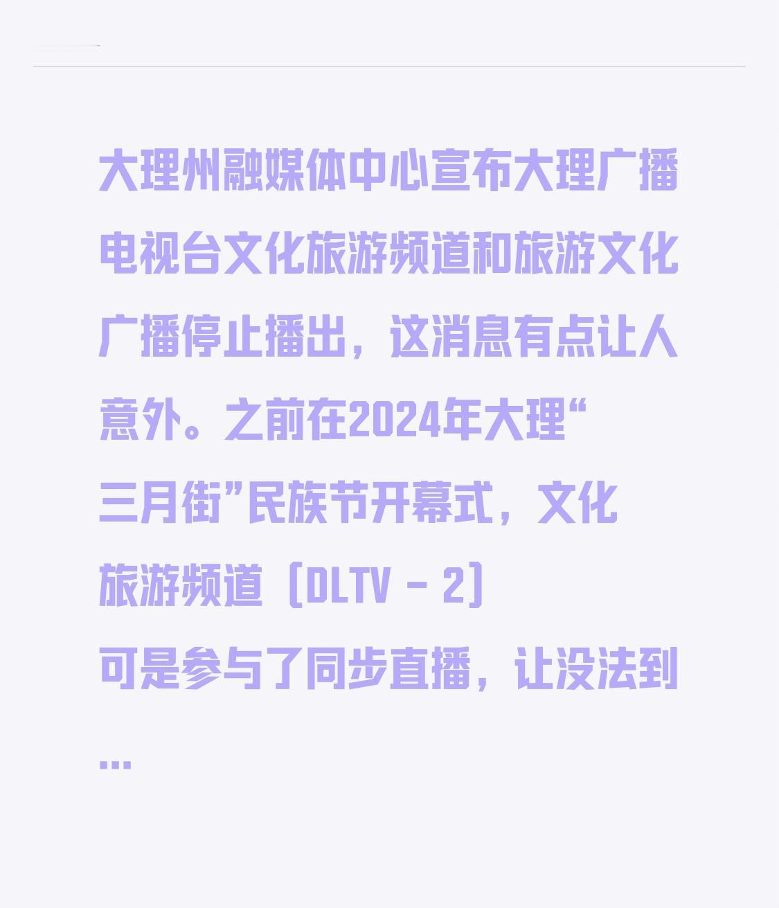 大理州融媒体中心宣布大理广播电视台文化旅游频道和旅游文化广播停止播出,这消息有点让人意外。之前在2024年大理“三月街”民族节开幕式,文化旅游频道(DLTV - 2)可是参与了同步直播,让没法到现场的人也能感受盛会氛围。 不过2025年11月有广播设备设施维护,17日上午9:00至20日上午9:00转播频率停止播出。现在这两个频道彻底停播,以后想听相关广播、看相关节目就没机会了,对喜欢通过它们了解大理文旅信息的人来说,还挺可惜的。 电视