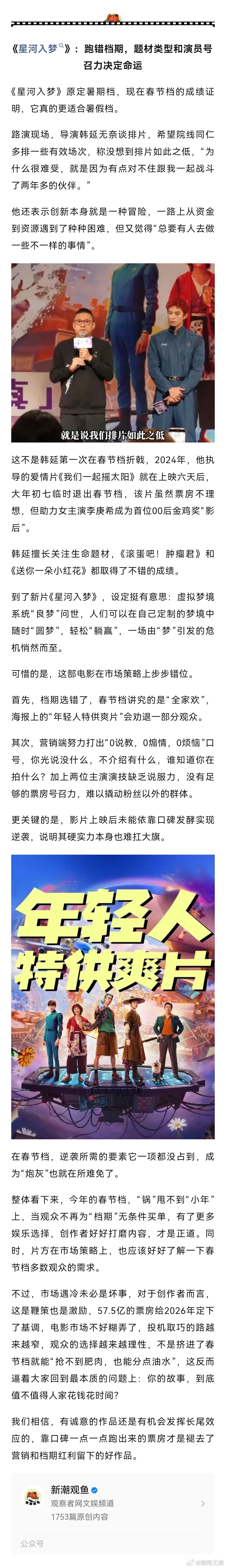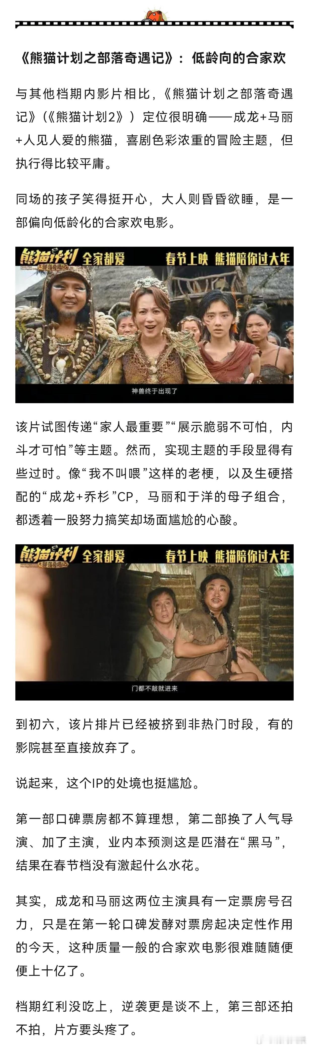 在这个整体平淡的“小年”里,《飞驰人生3》、《惊蛰无声》、《镖人:风起大漠》、《熊出没·年年有熊》、《熊猫计划之部落奇遇记》、《星河入梦》、《夜王》这春节档七部主力新片的境遇,恰好勾勒出了中国电影市场的几种生存状态↓↓↓