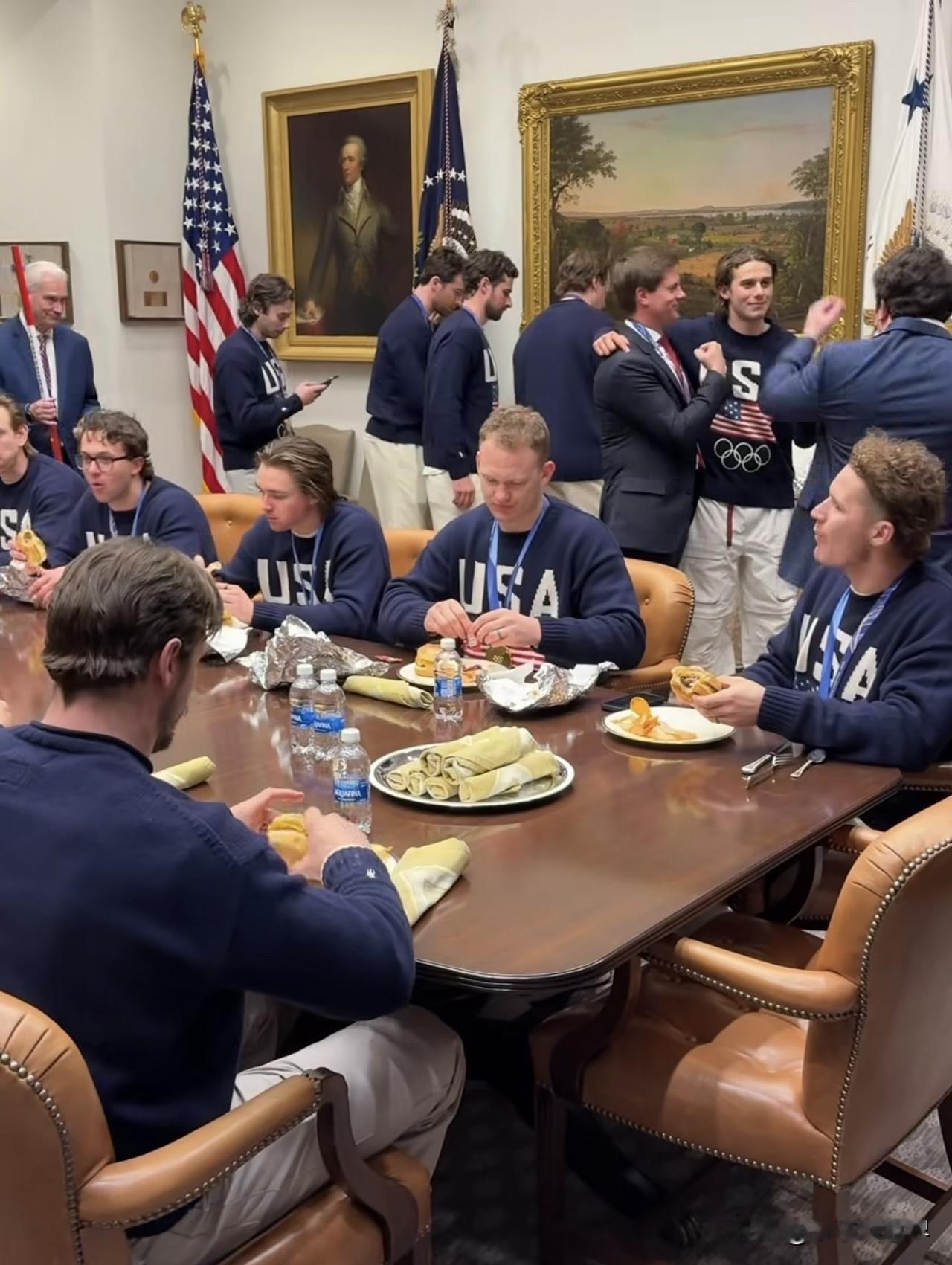 美國男子冰球隊奪冠後到訪白宮。 Brought to you courtesy of the Red, White & Blue 🇺🇸