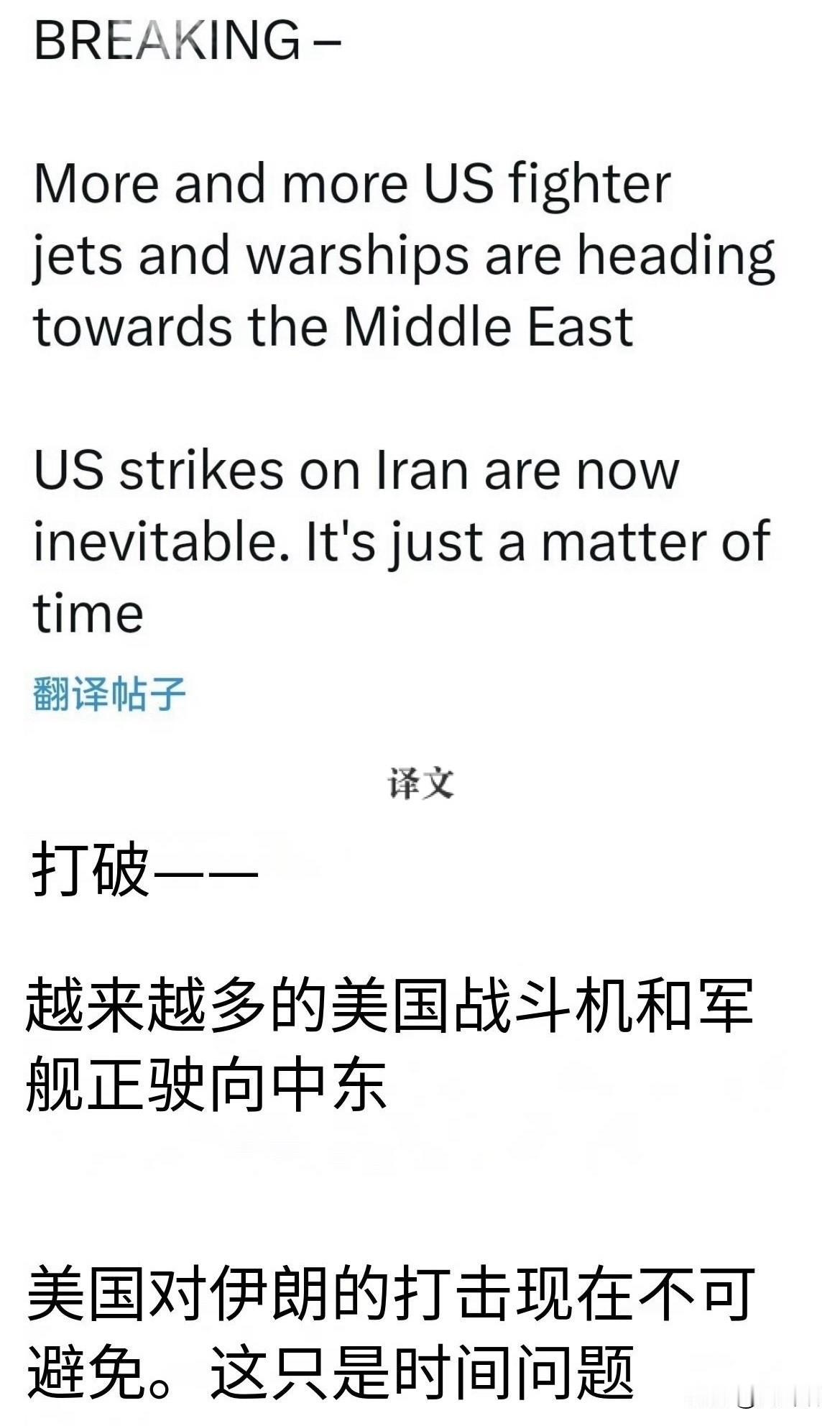 【美军打击伊朗只剩时间问题】 综合媒体消息,美国正向中东地区大规模增派战斗机与军舰,军事部署加速推进。 美方高层已明确表示,对伊朗的军事打击已不可避免,具体行动只是时间问题。 美国此举标志着双方紧张关系进一步升级,中东地区局势骤然紧张,引发国际社会对地区冲突扩大及潜在人道危机的深切忧虑。