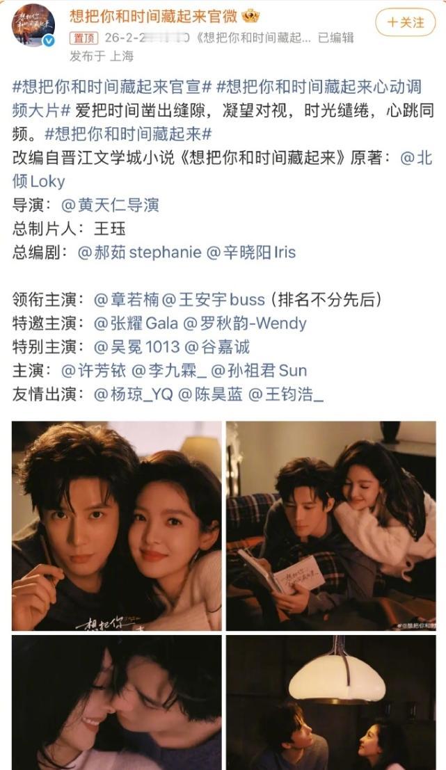 章若楠王安宇新剧正式官宣! 《想把你和时间藏起来》官宣章若楠王安宇领衔主演,俩人平番,排名不分先后,章若楠名字在前,王安宇粉丝有点不乐意,粉圈还是默认平番在前咖位更大,所以平番更容易吵架,最好的办法就是片方在官宣的时候连续官宣两个版本,一个女主名字在前,另一个男主名字在前,章若楠是光线一姐,背靠大公司资源不愁,王安宇是壹心艺人,如果能通过章若楠进一步搭上光线,那名字在章若楠后面对他来说也不吃亏。