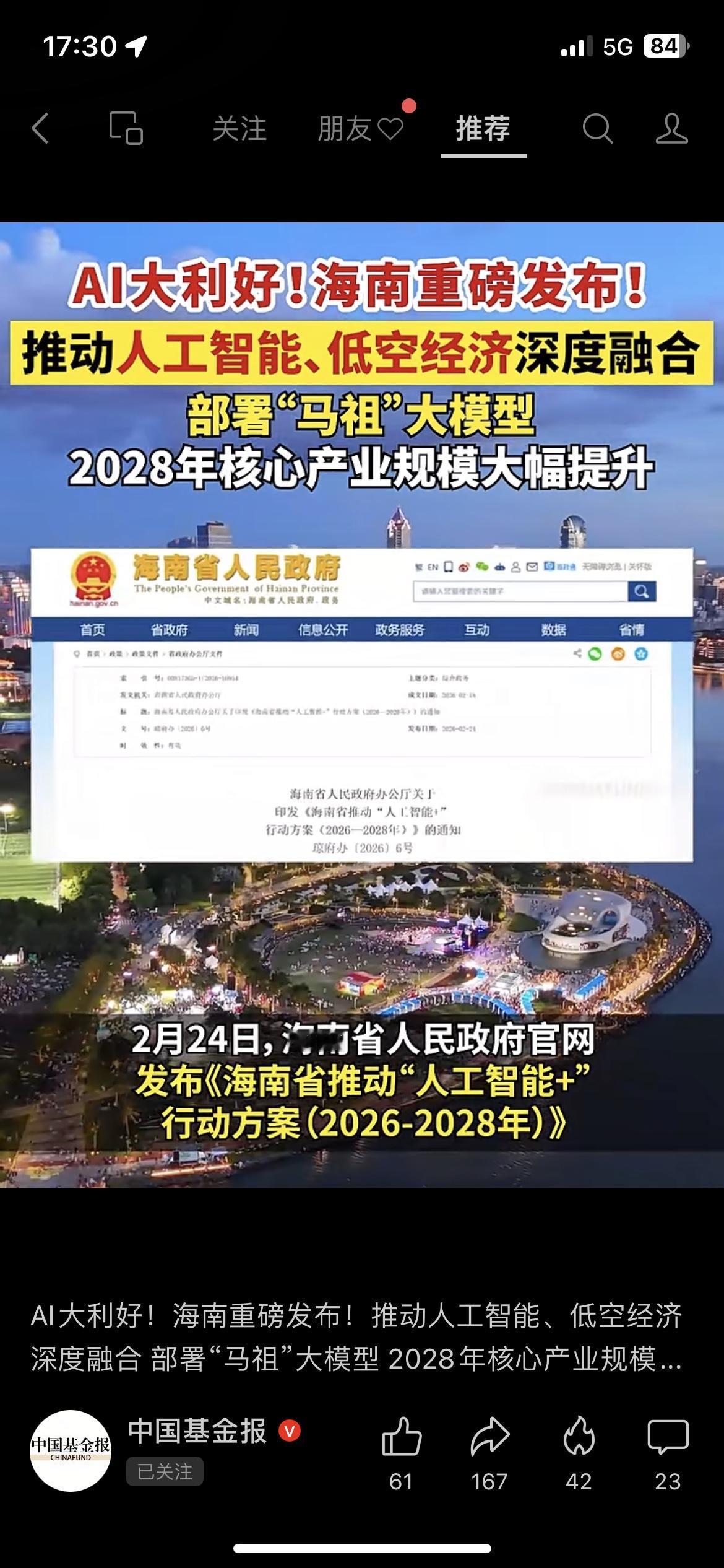 海南又放大利好! 正式发布“人工智能+”行动方案,专门部署“马祖”大模型。 重点很清晰: AI + 低空经济深度融合。 包括低空物流、观光旅游、海洋监测、应急救援等等。 简单说,以后在海南: 无人机送货、AI指挥低空飞行、智能海洋监控,都会慢慢变成现实。 这释放的信号非常明确: AI不再是纸上谈兵,而是真正落地到实体产业。 对普通人来说,这就是方向: 未来的机会,不在纯概念里,而在AI+实业、AI+生活、AI+产业里。 海南AI 马祖大模型