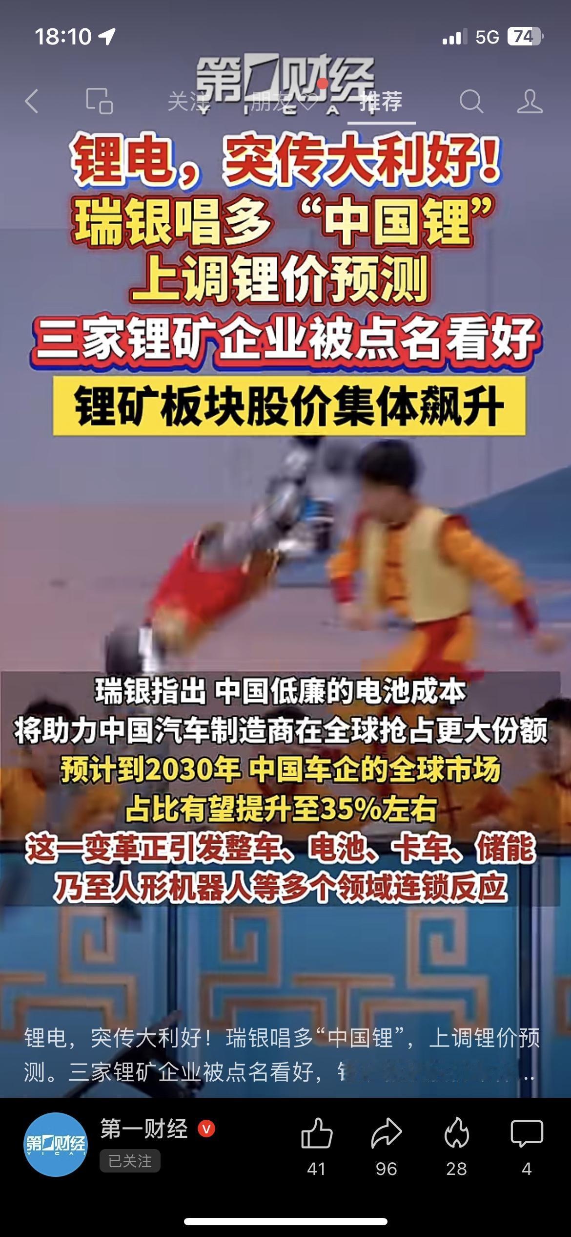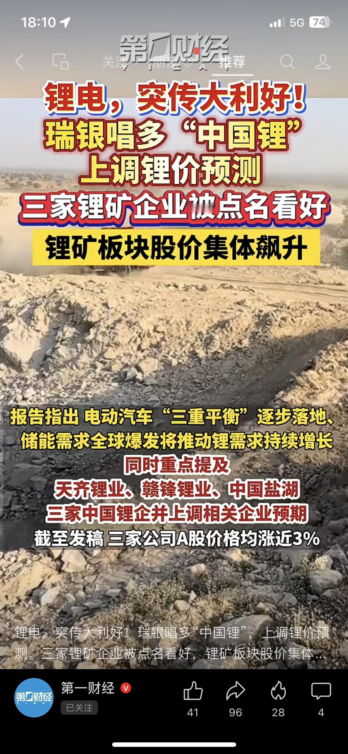 新能源板块迎来重磅利好! 瑞银直接唱多中国锂,上调锂价预测,相关板块应声大涨。 核心逻辑很简单: 中国电池成本优势全球领先,会进一步推动车企抢占全球市场。 车卖得越多,上游锂资源需求就越稳。 而且多家锂矿企业表示:春节正常生产,淡季不淡。 说明下游订单确实很扎实。 但我必须提醒一句: 周期板块波动大,利好落地也可能震荡。 千万别一看到大涨就无脑追。 看懂逻辑再入场,比跟风重要得多。 锂矿 新能源 锂电池 市场有风险,投资需谨慎,本文不构成任何投资建议。