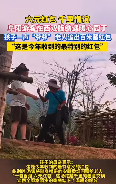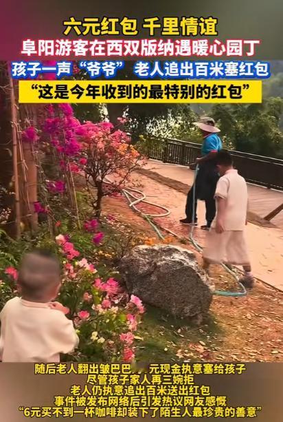 泪目!一位游客的孩子,因为喊了一声酒店门口给花草浇水的园林工“爷爷”,这个爷爷执意要给孩子6元红封,游客不收,园林工的一番话令游客破防:“他喊我爷爷是看得起我!” 一趟跨越千里的家庭出游,往往藏着太多不期而遇的温柔,从安徽阜阳远赴云南西双版纳游玩的一家四口,就亲身经历了一件让他们记一辈子的暖心事,没有华丽的铺垫,没有刻意的煽情,却凭着最朴素的真心,让无数网友看完都忍不住红了眼眶。 从安徽阜阳远道而来的李女士一家,就沉浸在这样明媚的风光里,享受着难得的旅途时光。 他们带着孩子逛遍了当地的特色景点,看够了新奇的热带植物,走累了便回到入住的酒店,打算在楼下的小花园里稍作休息,让孩子自由跑跳玩耍,谁也没有想到,一段平凡又动人的温暖故事,就在这个不起眼的酒店花园里悄然发生。 孩子天生对世界充满好奇,看到花园里形态各异的花草树木,便迈着小短腿跑前跑后,眼睛里满是欢喜。 不一会儿,孩子就注意到了正在专心打理花草的园林工人,老人穿着朴素的工装,皮肤被热带的阳光晒得黝黑,手上握着浇水的水管,小心翼翼地给每一株绿植浇水。 李女士家的孩子向来乖巧懂礼貌,平日里见到长辈都会主动打招呼,没有丝毫的生疏与怯场。 孩子没有因为老人身上的泥土、朴素的装扮而疏远,反而仰起稚嫩的小脸,迈着步子走到老人身边,用清脆又甜软的声音,认认真真地喊了一声 “爷爷”。 这一声毫无杂念的称呼,没有身份的隔阂,没有职业的区分,只是孩子发自内心的礼貌与亲近。 正在浇水的老人听到这声呼唤,瞬间停下了手中的动作,愣了几秒后,脸上立刻绽开了淳朴又灿烂的笑容,眼角的皱纹都挤在了一起,满是藏不住的开心与感动。 他放下水管,用粗糙的手掌轻轻擦了擦手上的水渍,弯下腰看着眼前的孩子,眼神里满是温柔,那是长辈对晚辈独有的疼爱,是被人真诚尊重后发自内心的欢喜。 老人的方言很重,说话时带着浓浓的当地口音,李女士一家人没能完全听懂他说的话,却能清晰地感受到他话语里的真诚与热情。 老人站在原地琢磨了一会儿,像是突然想起了什么,连忙拉开胸前挂着的小布包,伸手在里面仔细翻找起来。布包看起来用了很久,边角有些磨损,里面装着老人日常用的小物件。 他翻找得格外认真,指尖在物品间摸索,终于摸出了两张皱巴巴的纸币,一张五元一张一元,总共六元钱。 纸币的边角都卷起了毛边,被反复折叠过,看得出来是老人平日里省下来的零钱,是他靠双手劳作换来的微薄收入。 老人把两张纸币小心翼翼地叠整齐,用粗糙的手指捋平褶皱,然后郑重其事地弯下腰,执意要把这六元钱塞进孩子的手心里。 李女士看到这一幕,连忙上前阻拦,她心里清楚,老人做园林工作辛苦又劳累,这六元钱对老人来说格外珍贵,说什么也不能让孩子收下。 她一边轻轻推开老人的手,一边温柔地解释,说孩子只是礼貌打招呼,不用这么客气,让老人把钱收回去。 可老人却格外执拗,老人说,孩子喊他爷爷,是看得起他,没有嫌弃他的职业,没有把他当外人,这份心意太重,他必须要给孩子发个红包,这是长辈对晚辈的祝福,是不能推辞的。 李女士心里又暖又酸,依旧坚持不肯收,拉着孩子想要转身离开。没想到老人见状,立刻迈开步子追了上来,哪怕年纪大了,脚步也不算轻快,却依旧执着地追出近百米,一直跟在母子身后,执意要把六元红包塞给孩子。 他一边追一边摆手,让李女士不要再推辞,脸上始终挂着温和的笑容,没有一丝不耐烦,只有满满的真诚与善意。 李女士看着老人满头的银发、执着的神情,听着他朴实无华的话语,再也不忍心拒绝这份沉甸甸的心意,只好让孩子收下了这枚特殊的红包。 老人见孩子收下了红包,脸上的笑容更加灿烂,像是完成了一件无比重要的事,心满意足地转身回到花园里,重新拿起水管,继续打理那些花草,身影依旧平凡,却在那一刻变得格外耀眼。 从阜阳到西双版纳,相隔千里之遥,地域不同,风俗不同,生活方式也不同,却因为孩子一声天真的 “爷爷”,因为老人一份执着的心意,紧紧联结在了一起。 旅途的意义,从来不止是打卡网红景点,欣赏绮丽风光,更是在陌生的城市里,遇见温暖的人,感受人间的真情。 善意从来不分大小,尊重从来不分职业,人与人之间最动人的感情,永远是真心换真心,这份朴素的美好,会一直留在记忆里,温暖往后的每一段时光。 对于这件事,您有什么想说的吗?欢迎评论区留言讨论。 信源:颖淮新闻2026-02-24——《安徽阜阳一家人到西双版纳旅游,遇园丁爷爷浇水,孩子叫声“爷爷”老人追百米塞红包》