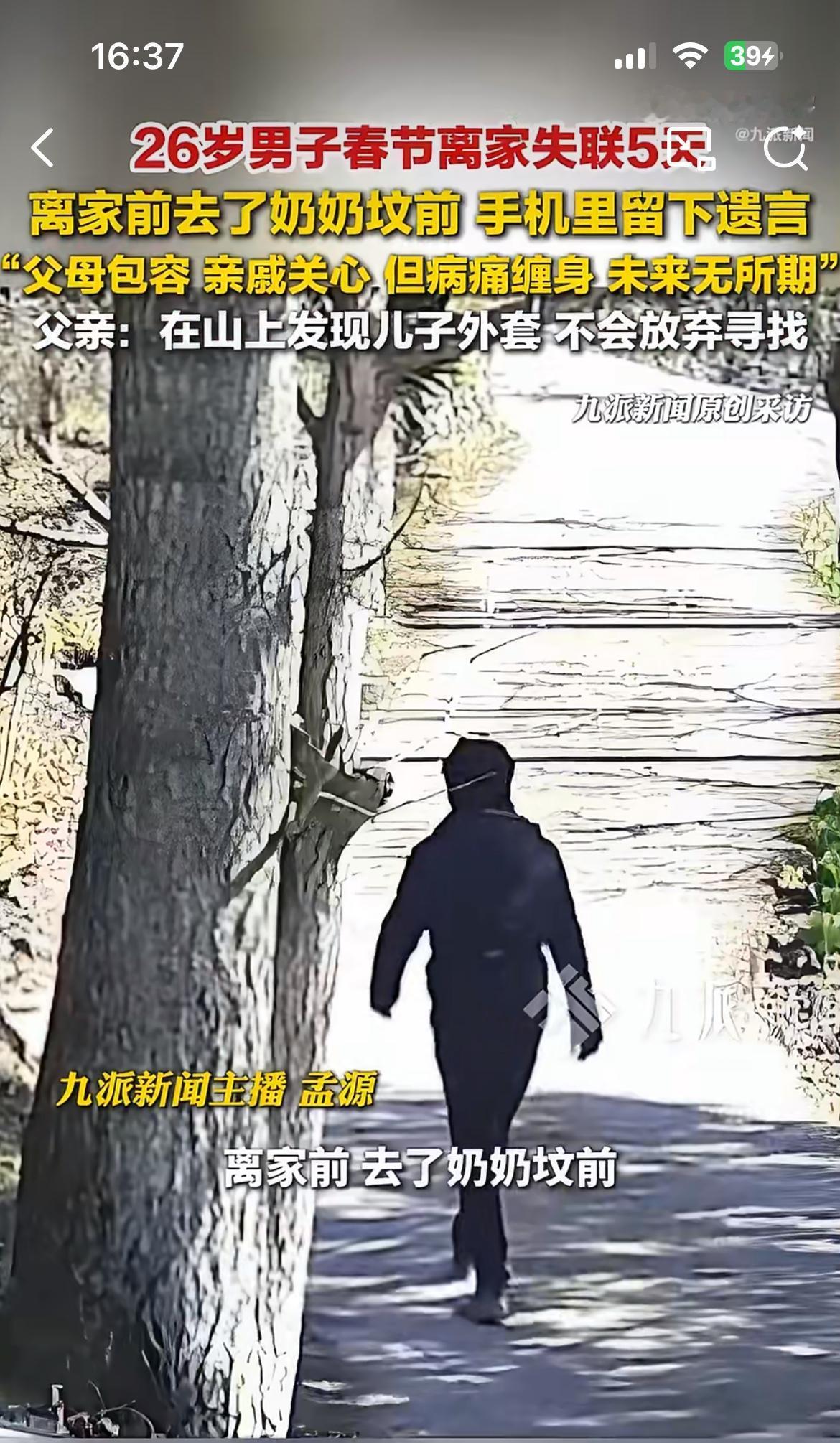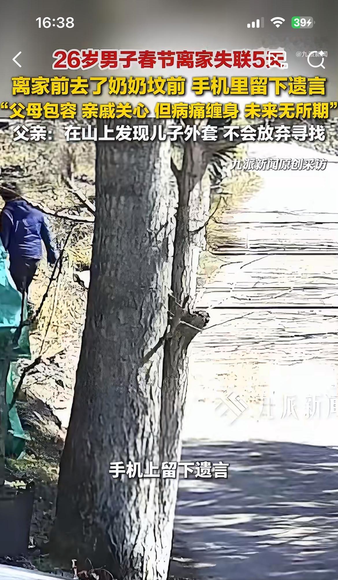 四川广元26岁男子大年初三外出自杀,生前留下4封遗书,句句戳心。男子是广元荣山镇鱼龙村人,大年初三2月19日离家未归,家人报警,2月25日在附近山林找到遗体。监控显示男子离家后,去奶奶坟前驻足12分钟,说明之前和奶奶感情好。他给父亲留言,要对自己好一点,别一直围着孩子操劳。对弟弟说,走出学校要擦亮眼睛,分清好人坏人。对朋友,称他是唯一没有被删除的人,说明是聊得来的朋友,坦言熬不动了,心理到极限。自述饱受病痛折磨,对未来已经绝望。家人介绍,男子在外接连工作受挫,回家后自闭了,几乎不出门社交。过年的时候,突然提出要去走亲戚,家人以为他心情好转了,没想到这只是他和亲友的最后告别。