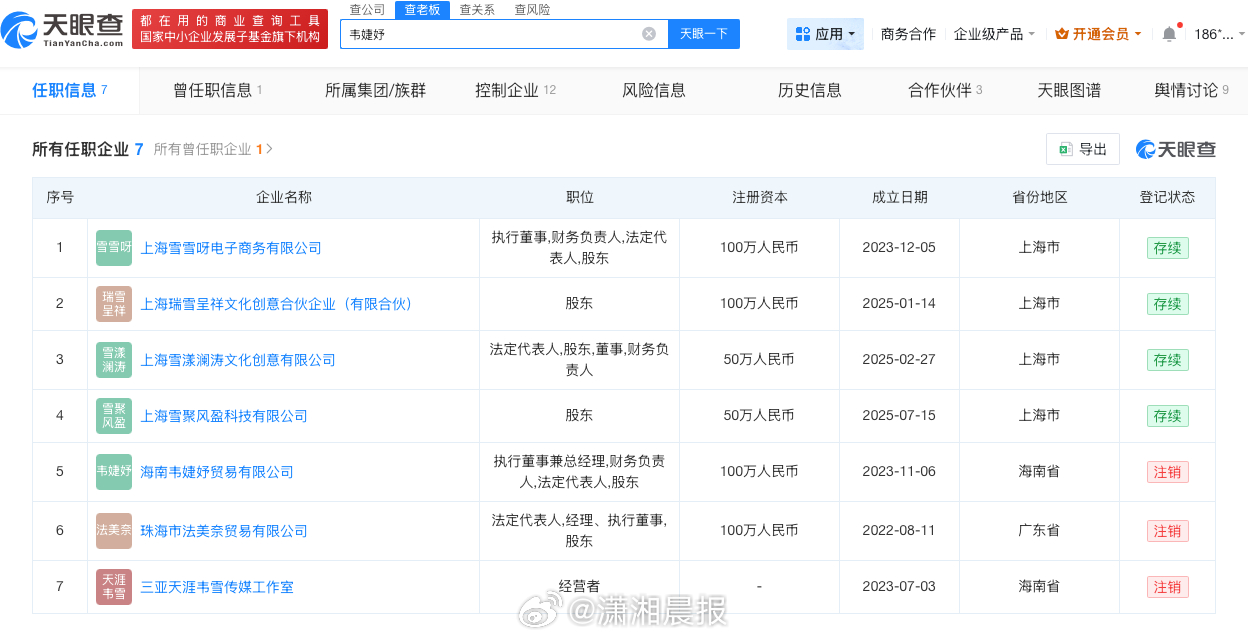 记者查询天眼查发现,韦婕妤(韦雪)共关联7家企业,其中4家为存续状态,包括上海雪雪呀电子商务有限公司、上海瑞雪呈祥文化创意合伙企业(有限合伙)等,韦婕妤在上述企业中担任执行董事、财务负责人等职务,版图涉及文化创意、电子商务等领域。其中,上海雪聚风盈科技有限公司成立于2025年7月。