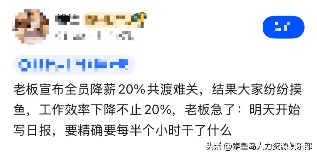 今天看到个特真实的案例,老板一句“公司困难,全员降薪20%,大家共渡难关”,结果咋样?同事们心照不宣,集体开启摸鱼模式,工作效率咔咔往下掉,何止20%啊。 老板一看急眼了,立刻下新规:明天开始都给我写日报,每半小时干了啥都得记清楚!这是把员工当生产线计时工了。 要我说啊,很多老板真容易想岔:觉得降薪就是省钱了,却没明白工资不止是钱,更是对大家干活的认可和安全感。你这边突然砍收入,那边画饼又填不饱肚子,谁还有心思拼命干? 更傻的是,一看效率低了,不是想办法激励,反而拼命盯梢、加汇报。结果呢?大家每天光琢磨怎么把日报编得饱满漂亮,真正干活的时间反而更少了。这哪是管理,简直是给自己挖坑,越管越忙,越忙越乱。 说到底,公司和员工明明是互相成就的。扣那点工资,寒了人心,丢的效率,哪多哪少啊?