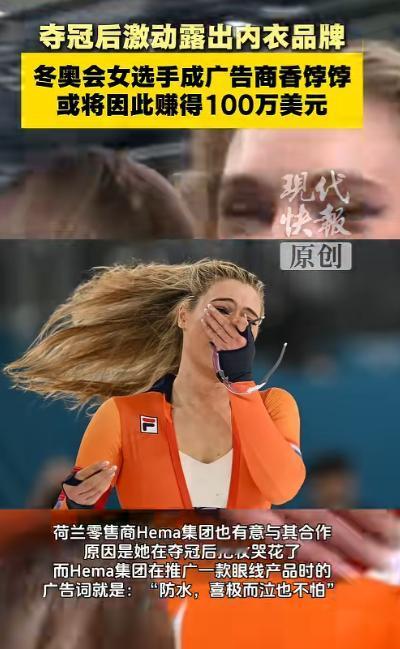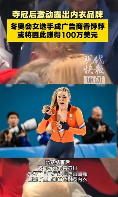 就因为激动时拉了一下衣服拉链,耐克直接送上100万美元。 谁都没料到,一场万众瞩目的冬奥速滑赛事里,运动员夺冠后一个毫无彩排的随性动作,竟能让荷兰速滑女将尤塔・莱尔丹,意外斩获百万美元的重磅合作,这不是杜撰的娱乐八卦,而是真切发生在米兰冬奥会赛场之上的真实事件,也让大众见识到了体育赛场自带的惊人商业爆发力。 本届冬奥会的女子 1000 米速滑决赛,算得上是冰雪项目里关注度顶尖的赛事之一,全球累计有超 3.2 亿观众通过直播、转播渠道观看了这场对决,赛场上汇聚了来自十余个国家的顶尖速滑选手,大家都憋着一股劲向奥运金牌发起冲击。 莱尔丹作为荷兰队的核心选手,在赛道上展现出了碾压级的竞技状态,每一次蹬冰发力都精准且有力,过弯时的重心把控更是堪称教科书级别。 全程牢牢占据领先位置,最终将金牌收入囊中,还一举刷新了该项目的奥运纪录,用实力在冰场上写下了属于自己的高光时刻。 冲过终点线的那一刻,莱尔丹积攒了许久的压力、疲惫与狂喜瞬间全部爆发出来,长期高强度训练和比赛带来的紧绷感彻底消散。 情绪上头的她,随手就把身上贴身速滑比赛服的拉链往下拉了一截,这个纯粹是为了放松透气的小动作,被赛场全方位布置的高清直播镜头完整记录下来。 随着拉链拉开,她内搭的耐克运动内衣清晰展露,品牌经典标识在镜头下格外显眼,这短短几秒的画面,借着冬奥会覆盖全球 200 多个国家和地区的转播信号,瞬间传遍了世界各个角落。 要知道冬奥会作为全球顶级体育盛会,赛场画面的传播力度本就超乎想象,莱尔丹这个自然又真实的举动,很快在海内外社交平台掀起刷屏热潮。 相关赛场片段在海外主流社交平台上线 24 小时内,播放量就直接飙升至 1.8 亿次,转发量突破千万,点赞、评论等互动数据更是高达 4500 万,远超同期不少冬奥赛事片段的传播数据,毫无悬念成为了当届冬奥最具热度的赛场瞬间之一。 耐克作为全球头部运动品牌,一直格外看重赛场中运动员带来的自然品牌曝光,其市场监测团队第一时间就捕捉到了这个极具价值的传播瞬间。 据业内专业营销机构测算,莱尔丹这次非刻意的品牌露出,为耐克带来的有效品牌触达人次超 8 亿,曝光价值远超常规投放的硬广资源,远胜于精心策划的商业营销方案。 凭借亮眼的赛场成绩和自带流量的真实表现,莱尔丹很快收到了耐克抛出的合作橄榄枝,品牌方直接敲定了价值 100 万美元的广告业务合作,这份从天而降的重磅合约,源头仅仅是夺冠后一次随性的拉拉链动作。 除了运动品牌的百万合作,莱尔丹在领奖台上的另一个真情流露瞬间,又为她解锁了全新的商业合作机会。 当奥运赛场上奏响荷兰国歌、国旗缓缓升起时,莱尔丹难掩激动心情,当场喜极而泣,肆意流淌的泪水直接冲花了脸上的眼妆,这个动人又真实的画面,被荷兰本土一家大型零售集团看在眼里。 该集团旗下主营彩妆产品,防水眼线更是年销量超 1200 万支的核心爆款,品牌方当即公开表示,十分有意向与莱尔丹达成合作,邀请她担任防水眼线产品的代言人,毕竟这种赛场真实落泪的场景,比刻意拍摄的广告片段更有说服力,也更能打动普通消费者。 在本届冬奥会中,莱尔丹的成绩远不止一枚金牌,她还在女子 500 米速滑项目中拿下银牌,一金一银的战绩让她成为荷兰速滑队的王牌选手。 接连的赛场高光加上两次意外出圈的真实瞬间,让莱尔丹的个人影响力直线飙升,冬奥期间其个人社交账号粉丝从原本的几十万,暴涨至 380 万,各类品牌合作邀约如潮水般涌来,涵盖运动、美妆、户外服饰等多个领域,妥妥成为了广告商争相争抢的香饽饽,整体商业价值迎来了跨越式上涨。 体育赛场的迷人之处,从来都不只是奖牌与纪录的更迭,更在于运动员身上展现出的不加修饰的真实与鲜活。 据市场数据统计,这类源于赛场的自然真实曝光,带来的消费者好感度转化率,比传统商业广告高出 37% 左右,这也是品牌方格外青睐这类瞬间的核心原因。 莱尔丹的所有出圈片段,没有丝毫刻意表演的痕迹,拉拉链透气、领奖台落泪,都是情绪到达顶点后的本能反应,也正是这份纯粹的真实,打动了亿万观众,也让品牌看到了背后的无限价值。 从冰场上奋力冲刺的专业运动员,到被各大品牌争抢的合作人选,莱尔丹的冬奥之旅充满了意外惊喜。 100 万美元的运动品牌合作、荷兰本土彩妆品牌的代言意向,这些额外的收获,都是对她多年赛场拼搏的温柔馈赠。 冬奥赛场的竞技荣耀会被永久铭记,而这份源于真实瞬间的奇妙商业际遇,也成为了本届冬奥会里一段趣味十足的插曲。 让更多人明白,体育赛场上最有力量的,永远是不掺任何虚假的真情实感。 对于这件事,您有什么想说的吗?欢迎评论区留言讨论。 信源:现代快报2026-02-17——《冬奥会女选手因露出内衣品牌或将收获100万美元广告业务》