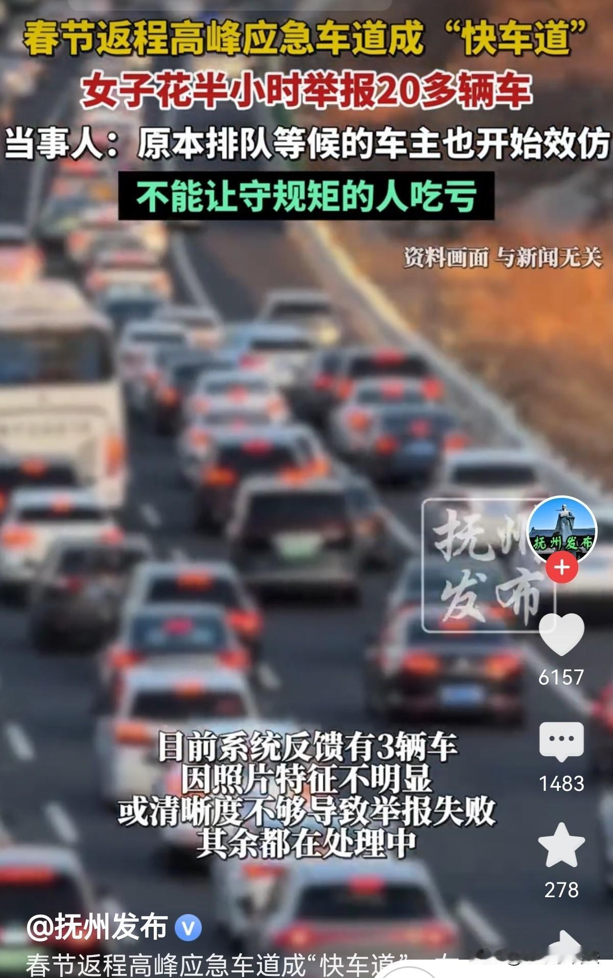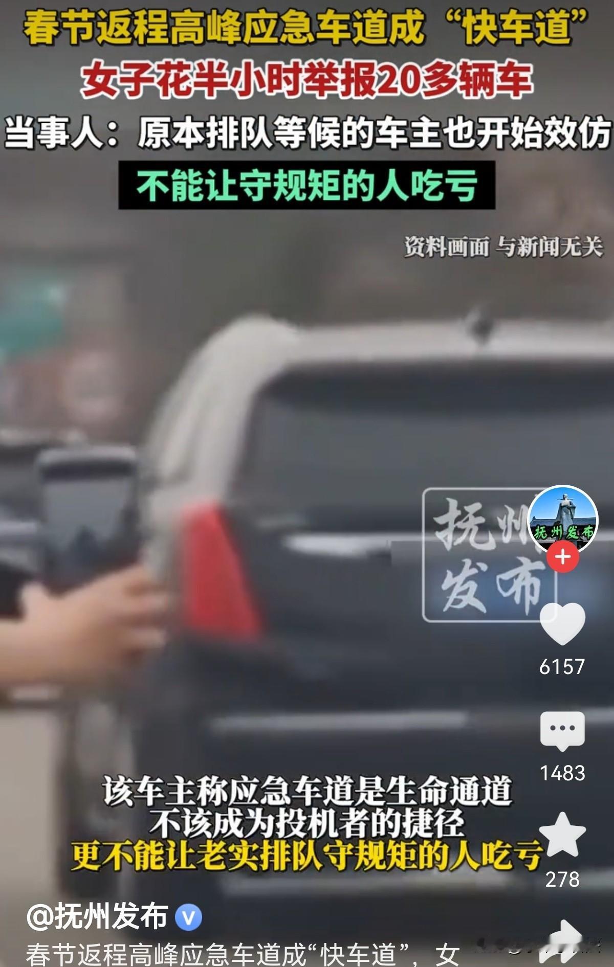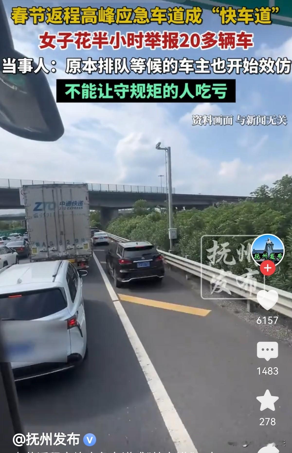 女子是从广西回湖北武汉,返程高峰期堵成一锅粥,在湖南高速长达6公里拥堵,慢慢挪行一个多小时。她坐在副驾上,看到有车竟进入应急车道,随后就有好多车效仿,应急车道成了快车道。女子很生气:为了快几分,司机不守规矩,占用高速上的生命通道投机取巧,这不公平!于是,她拿起手机找到湖南高速交通服务便民平台的“随手拍”功能进行举报,她花了半个小时时间举报了20多辆非紧急情况下在应急车道行驶的车辆。交警局正在处理此事。网友:支持举报!有不自觉的就得惩罚他们,以儆效尤! 春节假期刚过完,返程高峰就准时上线。 从2月22号开始,湖南境内好几条高速都陷入了拥堵,朋友圈、短视频平台全是被堵在路上的网友吐槽,一眼望不到头的车龙,成了高速上最扎眼的风景。 2月23号,女子和家人从广西出发,开车返回湖北武汉。 车子驶入湖南境内后,车流越来越密,慢慢就挪不动了。 她坐在副驾驶,看着导航上红色的拥堵路段,足足有6公里,系统显示要开将近一个小时才能通过。 家人稳稳地跟着车流排队,不抢不挤,可旁边的应急车道,却渐渐乱了套。 一开始只有一两辆私家车钻空子,踩着油门从应急车道往前冲,没过多久,越来越多的车开始效仿。 原本清亮的生命通道,硬生生被这些车变成了“快车道”,一辆接一辆呼啸而过,把老老实实排队的车辆甩在身后。 看着这一幕,女子心里又气又急,越看生气。 应急车道是高速上的生命通道,是救护车、救援车处理事故、抢救伤员的唯一通道,哪怕堵车再严重,也不能随便占用! 这些司机为了快几分钟,无视交通规则,不仅破坏了通行秩序,还可能耽误真正的紧急救援。 更让她难受的是,守规矩排队的人只能慢慢等,投机取巧的人反而一路畅通,这公平吗? “不能让老实人吃亏,也不能让这股歪风邪气越演越烈。”女子正义感爆棚! 她没有发脾气抱怨,而是拿出手机,开始寻找湖南高速的违法举报渠道。 一番搜索后,她找到了湖南高速交通服务便民平台的“随手拍”功能,刚好契合高速交警正在开展的违法举报活动,专门受理非紧急情况下占用应急车道的举报。 女子坐在副驾上,眼睛紧紧盯着应急车道,每开过一辆违法车辆,就赶紧拍下清晰的照片,记好车型、车牌,按照平台要求一步步上传信息。 车流缓慢挪动,她就一直举着手机拍摄、填写、提交,来来回回折腾了半个多小时,一口气举报了20多辆私家车。 过程中有3辆车因为拍摄角度问题,照片清晰度不够、特征不明显,系统审核没通过,剩下的举报信息全都成功提交,进入了处理流程。 做完这一切,她把自己的经历和部分举报车辆的照片发到网上,没想到立刻引来大量网友点赞。 大家纷纷留言支持,说不遵守规则就该被监督、受处罚,还有人夸她敢作敢为,守住了规则的底线。 这件事发酵后,有网友提出疑问:湖南高速交警不是临时开放了部分路段的应急车道吗,会不会是误会? 原来,为了缓解返程高峰拥堵,2月23号湖南高速警察官方发布消息,临时开放了多条高速的部分路段应急车道,但明确要求必须按指示通行,非高峰时段禁止占用。 面对质疑,女子很肯定地回应,自己举报的所有车辆,都不在临时开放的路段和时段范围内,每一笔举报都是实打实的违法占用。 记者随后联系了湖南省高速公路交通警察局,工作人员表示,春节假期返程期间,“随手拍”举报量暴增,他们已通知各个市州支队加急处理。 所有举报线索都会逐一核实,只是目前还在集中审核录入,需要一点时间。 《道路交通安全法实施条例》第82条第(四)项规定:机动车在高速公路上行驶,不得有非紧急情况时在应急车道行驶或者停车的行为。 《道路交通安全违法行为记分管理办法》违法占用应急车道行驶:一次记6分;违法停车(包括在应急车道内停车):一次记9分。 大部分人还是比较支持举报的,首先,应急车道本来就是遇到突发情况供救援车辆通行的,如果大家都这样走,应急车道也堵了。 如遇到车祸怎么办呢?堵车无外乎就3种情况,前车龟速行驶,车流量太大,车祸。多一点时间多一份安全。安全到达目的地才是最重要的,不要说人家嫉妒! 对此个别人觉得:这女人不地道,太缺德!人生在世,这大过年的害人的事不要做! 还有人说,很多地方已允许应急车道在拥堵时可以借用,是借用,不是占用。 应急车道也是道,不能在拥堵的时刻,让应急车道闲置在那里,这是资源的浪费。应急车道,你可以在上面走,但不能在上面停。 一场返程拥堵,一次认真的举报,不仅揪出了二十多辆违法车辆,更戳中了很多人对交通规则的共鸣。 高速行车,守规矩不是约束,而是对自己和他人生命的负责。 对此您怎么看?