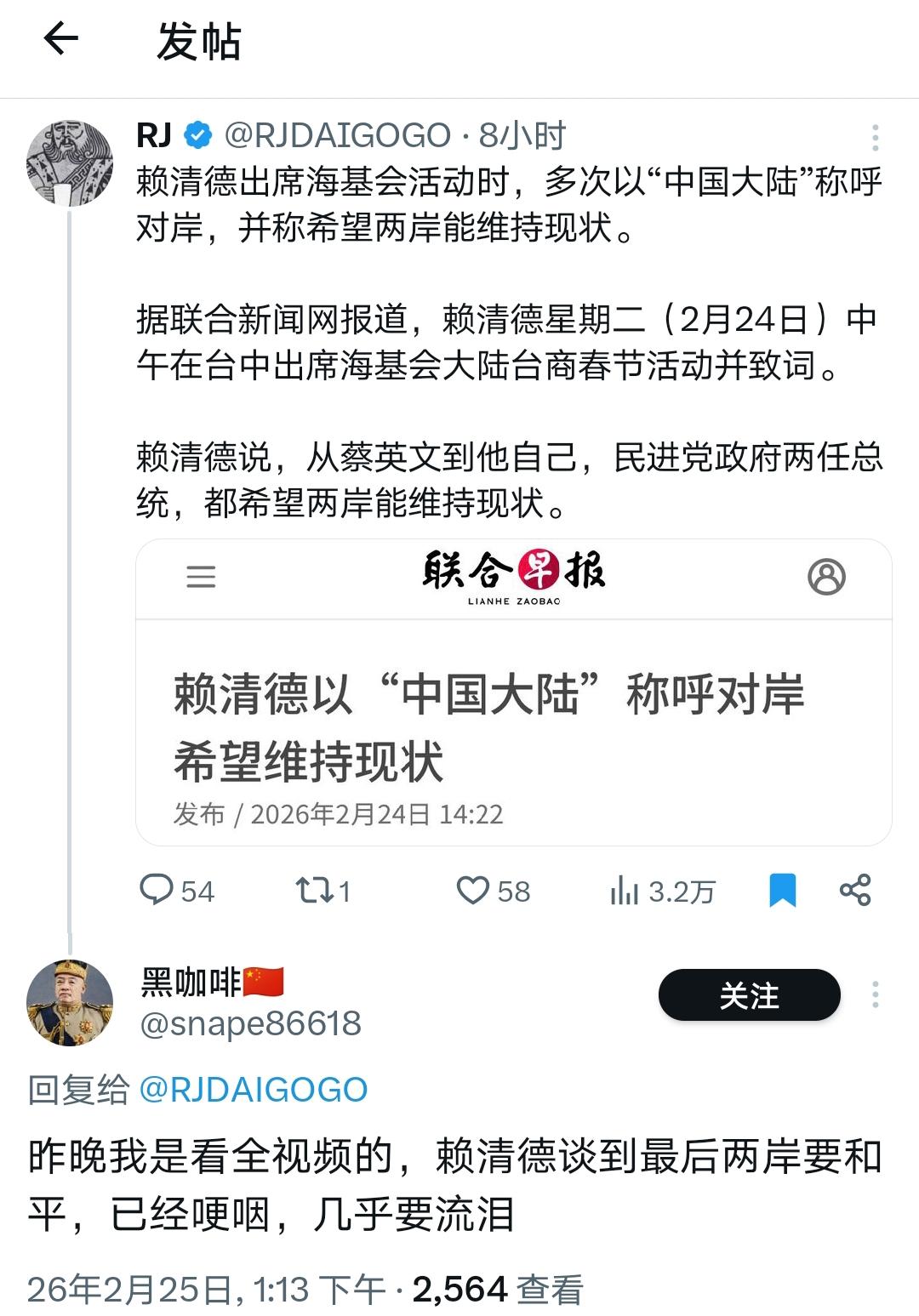 赖威廉这是在干嘛?步步紧逼KMT! 很明显,不管是骗票还是装温和,赖清德往中间挪移的哪怕只有一小步,都会直接挤压老K在岛内的政治空间。 郑丽文除了再往大陆方向往前一步,已经没有别的路可走 —— 原地不动或后退,都是死棋。 而对我们而言,这就是切香肠式统一:不管蓝绿愿不愿意,都在被大势推着,一步步向统一靠近。 Source: X