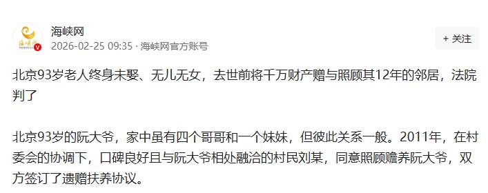 北京93岁老人终身未娶、无儿无女,去世前将千万财产赠与照顾其12年的邻居,法院判了! 海峡网报道了北京顺义的一个案子刷爆了全网,事情的主人公是一位93岁的阮大爷(化名),在大爷走后把名下价值千万的五套安置房和补偿款,全留给了照顾他12年的邻居刘某(化名),而不是自己的亲妹妹和侄女们,最后法院的判决,也让不少人直呼公道。 要知道的是阮大爷一辈子没结婚,也没有儿女,家里虽说有四个哥哥和一个妹妹,但平日里来往不多,关系一直很平淡。 到了2011年,81岁的阮大爷身体大不如前,没人照料起居,实在没办法,就向村委会求助。 刚好同村的刘某口碑不错,和阮大爷平时也合得来,在村委会的协调下,刘某答应照顾阮大爷,两人当场签了遗赠扶养协议,约定刘某负责老人的生养死葬,阮大爷百年后,就把村里的11间房屋留给刘某。 签完协议,刘某夫妻俩干脆搬去和阮大爷同住,方便随时照料。 然而老人有哮喘,换季的时候容易犯病,刘某就花钱买了医用床和五台带雾化功能的制氧机,平时每天早上都给老人煮鸡蛋、热牛奶,变着花样做可口的饭菜。 闲下来的时候,还陪老人下棋、聊天,逢年过节一家人陪着老人,连刘某的孙子孙女都会给老人磕头拜年,这些温馨的片段,刘某都用视频记录了下来。 直到2017年的时候,阮大爷住的村子拆迁,他分到了380多万补偿款和五套安置房,财产一下子多了起来,但他没改变主意。 2023年3月,93岁的阮大爷特意找了两位律师见证,和刘某重新签了一份遗赠扶养协议,明确表示自己百年后,所有财产包括五套安置房,都留给刘某。 同年10月,阮大爷因病去世,刘某按约定妥善料理了老人的后事,从头到尾都尽心尽力。 可没想到,阮大爷的亲妹妹和二哥的两个女儿站了出来,不认可这份协议,觉得老人年纪大了,可能是被诱导签的字,还怀疑刘某没尽到照顾义务。 没办法,刘某只能起诉到法院,请求确认协议有效。 法院走访了村里的村民和村委会工作人员,大家都作证,刘某这12年对老人是真的好,老人的生活水平在村里算得上中上等,还经常跟人夸刘某贴心。 加上刘某提交的视频、律师见证材料,都能证明两份协议都是阮大爷的真实意思,没有任何胁迫、诱导的情况。 最后法院判决,阮大爷的五套安置房所有权益,都归刘某继承,双方都没有上诉,判决已经生效。 其实这事说起来,没什么复杂的,阮大爷无儿无女,亲属虽在却疏于照料,是刘某12年如一日的陪伴和照顾,让他安安稳稳度过了晚年。 很多人说刘某是为了财产,可12年前签协议时,没人知道村子会拆迁,刘某当初答应照顾,更多的是一份善意。 而且法律上本就有遗赠扶养协议的规定,优先于法定继承,这既是保护老人的意愿,也是对付出者的认可。 亲情从来不是靠血缘绑定的,比起那些有血缘却不露面的亲属,刘某的12年陪伴,更配得上这份回报。 这事也给很多人提了个醒,对于孤寡老人来说,遗赠扶养协议或许是解决养老问题的一个好办法,也让我们看到,善良和付出,终究会得到回报。 对此您有什么不同的看法,可以在评论区留言讨论!!! 信息来源:海峡网