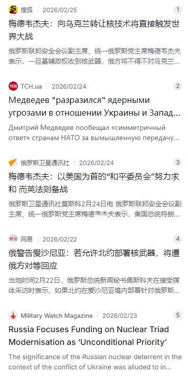 梅德韦杰夫:一旦战败,就用核弹攻击4个国家,让世界进入末日,将动用战略核武器针对 乌克兰 、 德国 、 英国 和 美国 进行打击,从而引发全球性毁灭。 麻烦看官老爷们右上角点击一下“关注”,既方便您进行讨论和分享,又能给您带来更多优质的内容,感谢您的支持! 莫斯科那边又扔出了一枚“政治核弹”,直接把全世界的眼球都给震了一下。说这话的不是别人,正是俄罗斯的前总统、现在的联邦安全会议副主席梅德韦杰夫。他在社交媒体上撂下狠话:要是英法真的敢给乌克兰递核武器,那俄罗斯可就不客气了,不仅会往乌克兰扔战术核弹,那些送货上门的北约国家,特别是英国和法国,也得一块儿跟着“陪葬”。 这事儿听起来邪乎,但其实是有导火索的。就在前几天,俄罗斯对外情报局突然放出一个猛料,说他们掌握确凿情报,英国和法国正背着人搞小动作,打算秘密给乌克兰输送核武器或者相关的核心技术。据说方案都整出两套了:要么是直接提供能装在法国导弹上的TN-75小型核弹头,要么就是帮乌克兰造那种虽然威力小点、但放射性污染极强、能恶心人的“脏弹”。这消息一出,克里姆林宫那边立马就炸了锅,佩斯科夫直拍桌子,说这要是真的,那就是对国际法的公然践踏,性质全变了。 梅德韦杰夫更是借着这股火气,直接在台上把调门拉到最高。他的逻辑很直接:这哪还是什么偷偷摸摸的援助,这就是明着给一个正在打仗的国家递核武器,等于是在莫斯科的红线上蹦迪。他说这种情况下,俄罗斯不可能忍气吞声,必须得亮出看家本领。按他的说法,战略核武器可能都要被摆上桌,目标不光是乌克兰境内的军事设施,那些敢当“快递员”的英国和法国,甚至背后一直操盘全局的美国,都在打击范围之内。这就像是说,既然你们要把火引到我家里来,那我就干脆把整个房子连同邻居一起点了。 不过话说回来,这种末日般的威胁虽然听着瘆人,但里头其实藏着不少政治算计。明眼人都看得出来,这是俄罗斯在常规战场上打得比较吃力,手里能打的牌不多,只好把压箱底的“核大棒”拿出来挥舞一下,主要目的还是为了吓唬人。你想,真要按他说的那样把核弹扔遍欧美,那地球确实离毁灭不远了,这种同归于尽的打法,不到最后关头谁也不会真干。所以国际社会普遍觉得,这更像是梅德韦杰夫在搞心理战,一方面是想吓阻北约别越线,另一方面也是演给国内老百姓看的,好让大家伙儿团结起来,觉得只有硬碰硬才能保住国家。 更有意思的是,西方那边对这事儿反应也挺逗。英国政府直接翻了个白眼,说俄罗斯这是在胡说八道,纯粹是为了转移大家对乌克兰战场的注意力,根本没这回事。可话虽这么说,私底下北约各国肯定得抓紧时间商量对策,既然俄罗斯把核门槛说得这么低,那欧洲的军备部署也得跟着调整,这你来我往的,一场新的军备竞赛眼看着就又要升温了。 其实这事儿往深了看,暴露出的问题是现在全球的核安全网已经快漏成筛子了。就在这个月初,美俄之间最后一项核军控条约《新削减战略武器条约》正式到期失效,冷战结束以来维系了几十年的大国核平衡,算是彻底断了线。没有了这些条条框框的约束,加上战场上的挫败感,像梅德韦杰夫这样的强硬派自然就把核武器当成了最顺手的政治工具。普京前几天也说了,核三位一体的现代化是国家的“无条件优先事项”,得接着砸钱搞。这种气氛下,哪怕这次只是嘴炮,谁敢保证下次不会因为一次误判、一个信号没接对,就真的把世界推到那个只剩85秒就到午夜的“末日时钟”边上呢?咱们这些隔岸观火的人,也只能盼着那些手里攥着核按钮的大人物,能比现在更清醒一点。