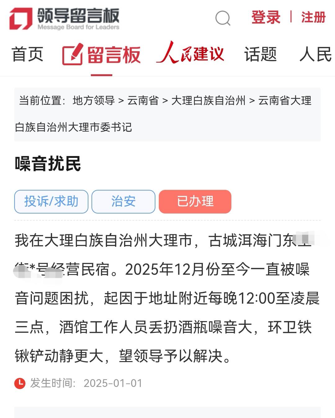 2月9日大理网民通过人民网领导留言板向大理市市委书记反映大理古城洱海门附近民宿及环卫 ▶️噪音扰民 我在大理白族自治州大理市,古城洱海门*街*号经营民宿。2025年12月份至今一直被噪音问题困扰,起因于地址附近每晚12:00至凌晨三点,酒馆工作人员丢扔酒瓶噪音大,环卫铁锹铲动静更大,望领导予以解决。 发生时间:2025-01-01 官方回复:2026-02-24 19:01 大理市综合行政执法局 网民同志,您好! 您于2026年2月9日通过人民网领导留言板向大理市市委书记反映大理古城洱海门X街*号民宿附近酒馆丢扔酒瓶噪音大,环卫铁锹铲动静更大,一直被噪音扰民的问题。现将相关情况回复如下: 接到您的问题反映后,我局高度重视,立即组织城市运营管理服务中心进行核查处理。针对存在的问题,我局已督促环卫服务公司进行整改,及时提醒环卫工人在收集清运生活垃圾过程中尽量降低作业噪音。同时,入户对民宿周边商铺及酒吧下发了《生活垃圾投放通知书》,明确要求商户自觉规范生活垃圾收集处理管理规定,严禁将啤酒瓶等倾倒到垃圾集箱体内。 下一步,我局将持续提升环境卫生精细化管理,严格落实城市环境卫生考核制度,督促公司不断提高强化环卫作业服务保障水平,努力营造干净整洁、规范有序的城市环境,进一步增强市民群众的获得感和幸福感。 另外,经营活动噪音扰民的问题属公安部门管理权限范围,您可以向职能部门反映,予以有效解决。 感谢您对城市管理工作的理解和支持! 大理市综合行政执法局 2026年2月14日