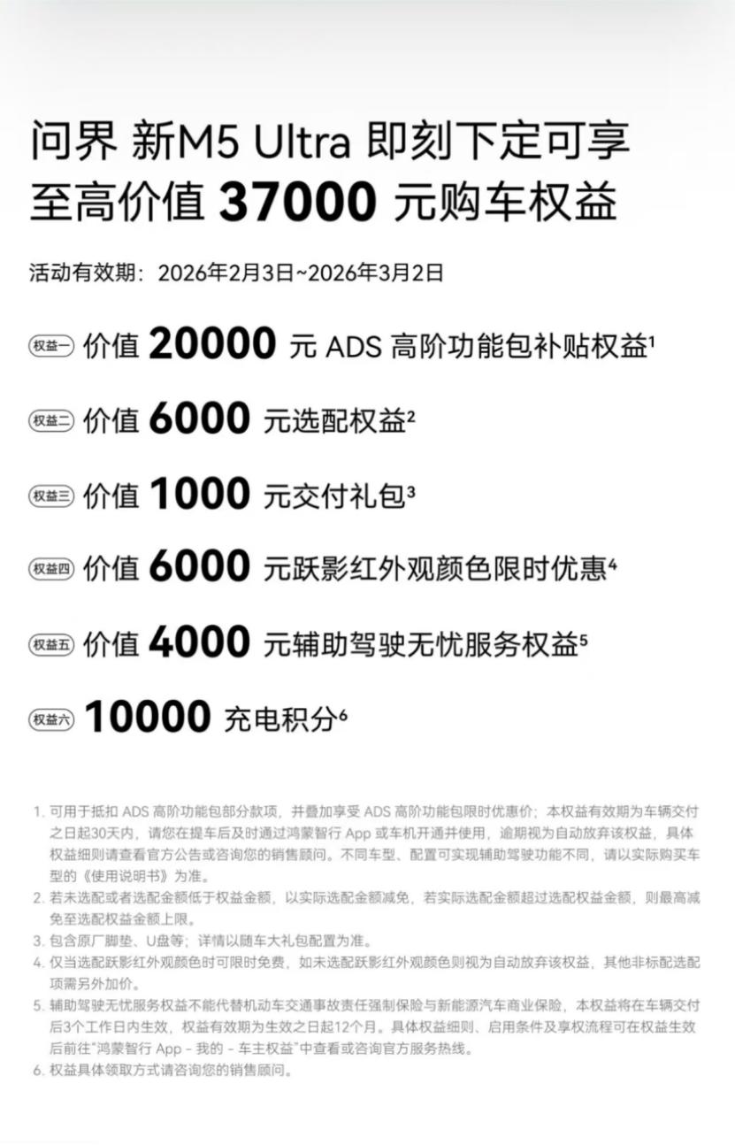 春节返程不再受罪?这台车让我期待下次长途 以前节后返程是煎熬,现在开问界新M5 Ultra返程,没想到反而成了一种享受。作为20万级智价比最优选,它全系标配华为乾崑智驾ADS 4,升级192线激光雷达,路上那些小锥桶、故障车都能精准识别。跑长途时开启NCA,车子自己判断变道时机,果断又稳妥,精力消耗少一大半,到家还能精神饱满地准备第二天上班。全向防撞加紧急转向辅助,就像有个老教练在旁边帮你盯着,安全感拉满。现在购车至高可享37000元权益,4000元辅助驾驶无忧服务和10000充电积分,特别实用。预算20万左右想要最前沿辅助驾驶体验的,问界新M5 Ultra是绕不开的选择。