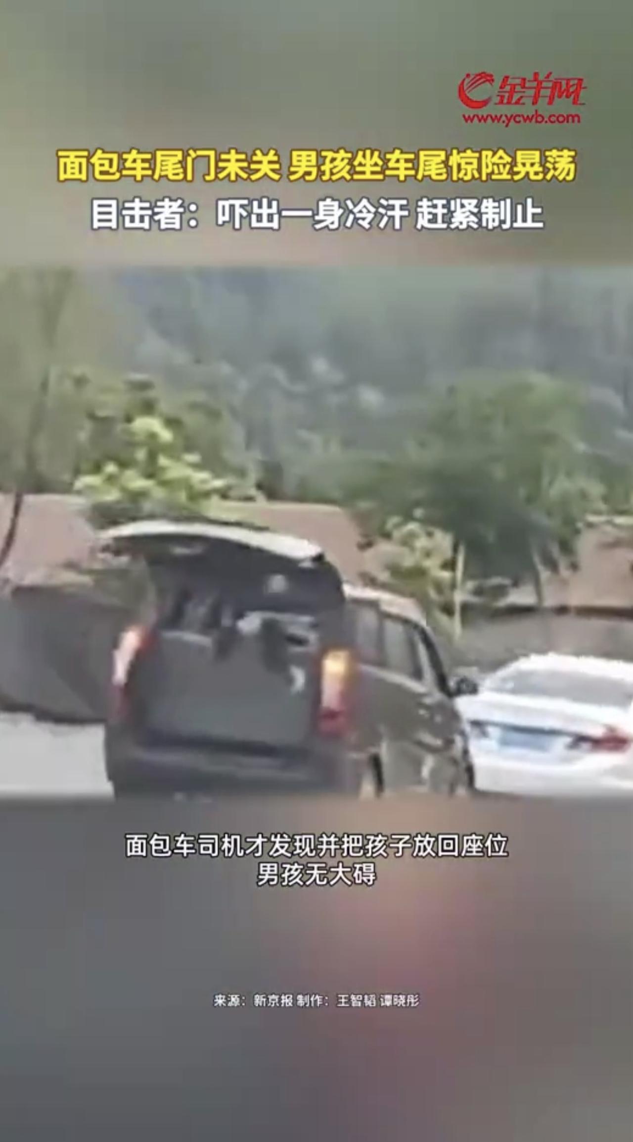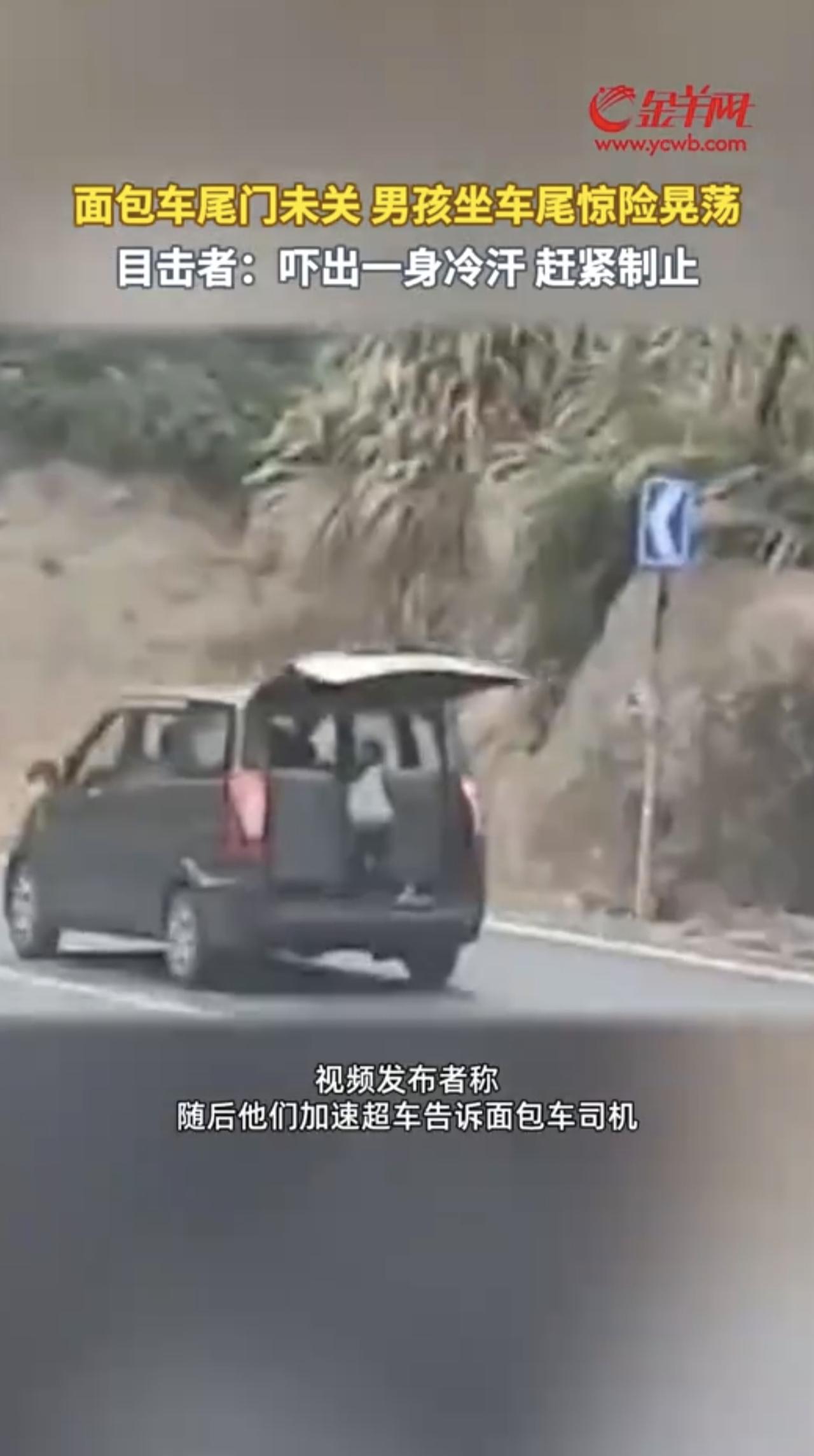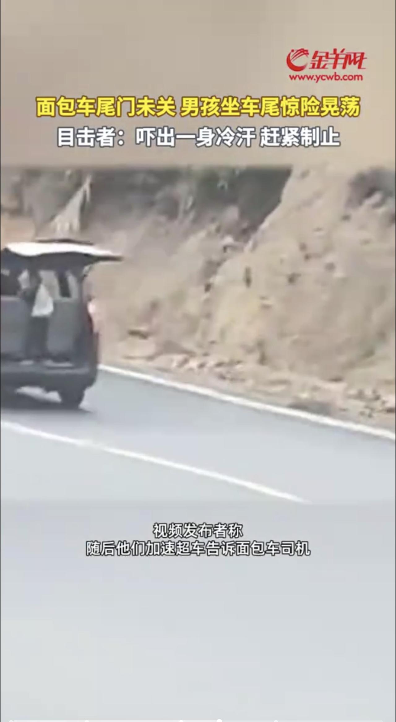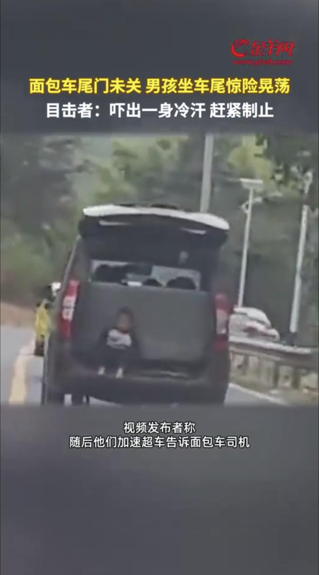 面包车尾门未关,男孩坐车尾惊险晃荡,目击者:吓出一身冷汗,赶紧制止。行车安全 交通安全