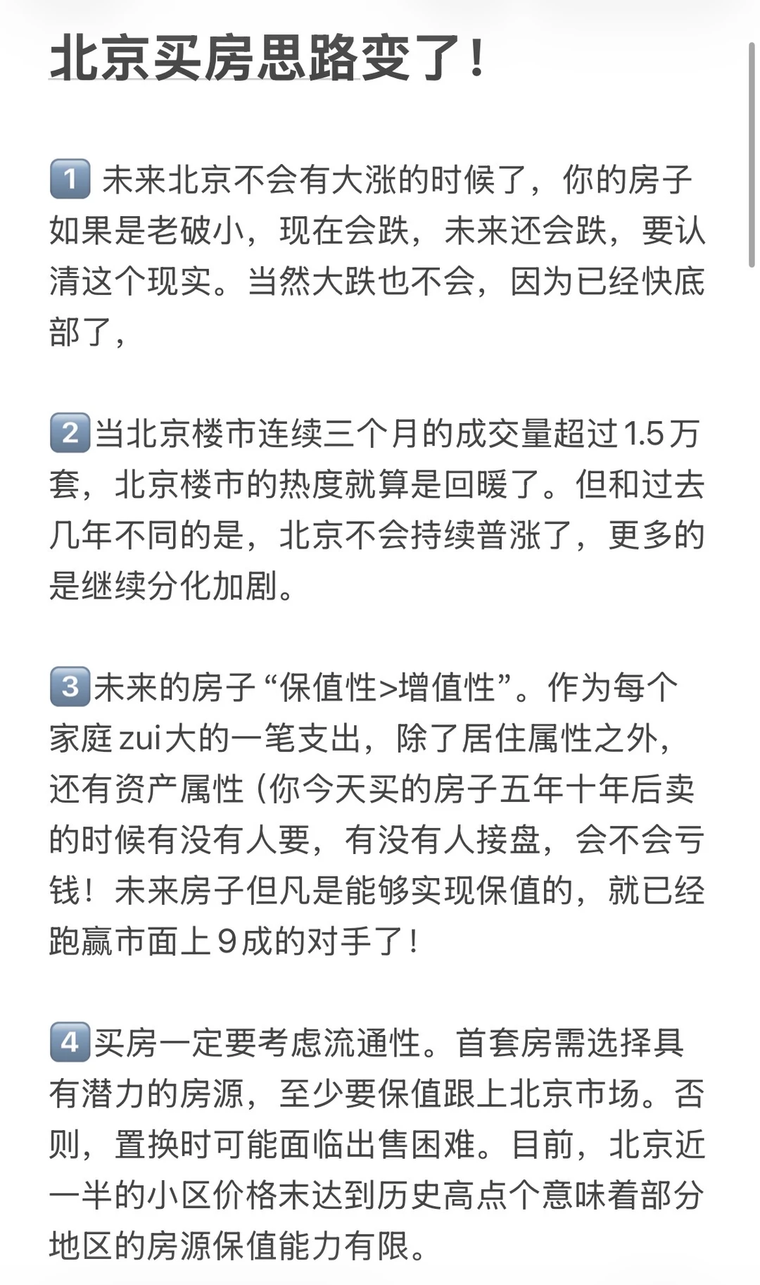 1️⃣ 未来北京不会有大涨的时候了,你的房子如果是老破小,现在会跌,未来还会跌,要认清这个现实。当然大跌也不会,因为底部了