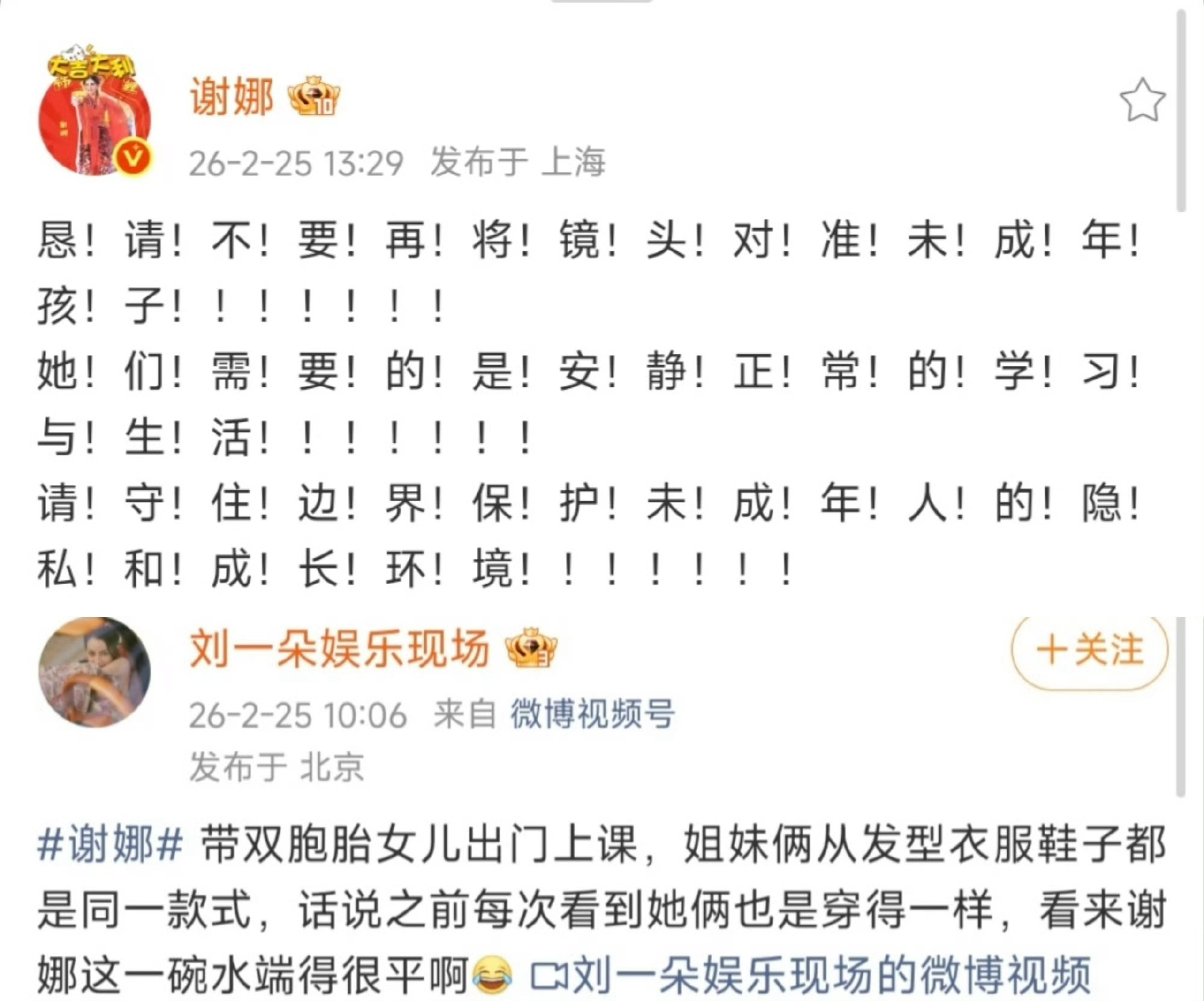继谢娜发文恳请不要再将镜头对准未成年人后,张杰也发博,内容是《未成年人保护法》《儿童个人信息网络保护规定》