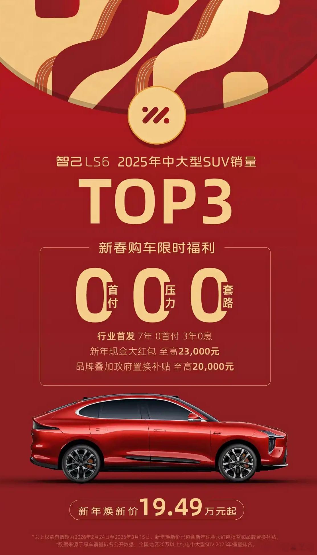 懂车之道讯 懂车之道快讯,智己LS6推出新年焕新价19.49万元起,新年现金大红包至高2.3万元,并带来7年0首付,3年0息,5000元置换补贴(品牌叠加政府置换补贴至高2万元)等金融购车方案。
