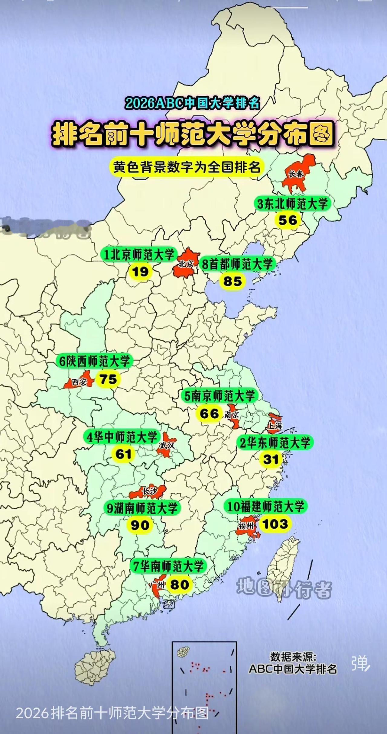 展示2026年ABC中国大学排名中的师范类大学前十强分布情况。根据榜单数据,这十所高校在全国综合排名中均位列前100名,呈现出“北强南弱、东多西少”的地域分布特征,且“985”与“211”高校占据了绝对主导地位。榜单前十名中,北京师范大学(全国第19)和华东师范大学(全国第31)稳居冠亚军,作为唯二的“985”师范院校,其综合实力遥遥领先。第三名由东北师范(全国第56)获得,其作为“211”高校,学科覆盖面广,实力强劲。第四至第十名依次为华中师范大学(61)、南京师范大学(66)、陕西师范大学(75)、华南师范大学(80)、首都师范大学(85)、湖南师范大学(90)和福建师范(103)。从地域分布来看,这十所高校主要集中在东部沿海和中部地区。其中,北京独占2席(北师大、首师大),上海、江苏、湖北、湖南、陕西等各占1席,显示出教育资源较为分散均衡。值得注意的是,陕西师范大学(西安)作为西部地区的代表,成功跻身前十,体现了西部高等教育的深厚底蕴。此外,华南师范大学(广州)和湖南师范大学(长沙)的入选,也反映了南方地区在师范教育领域的强劲竞争力。整体来看,该榜单不仅反映了各校的学术实力,也揭示了我国优质师范教育资源的区域分布格局。