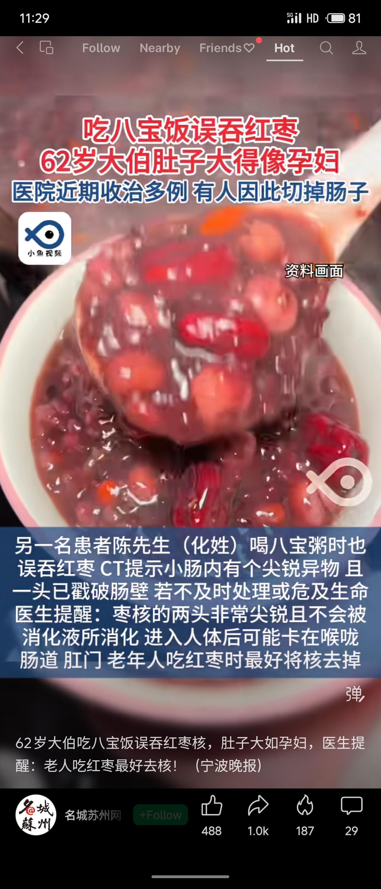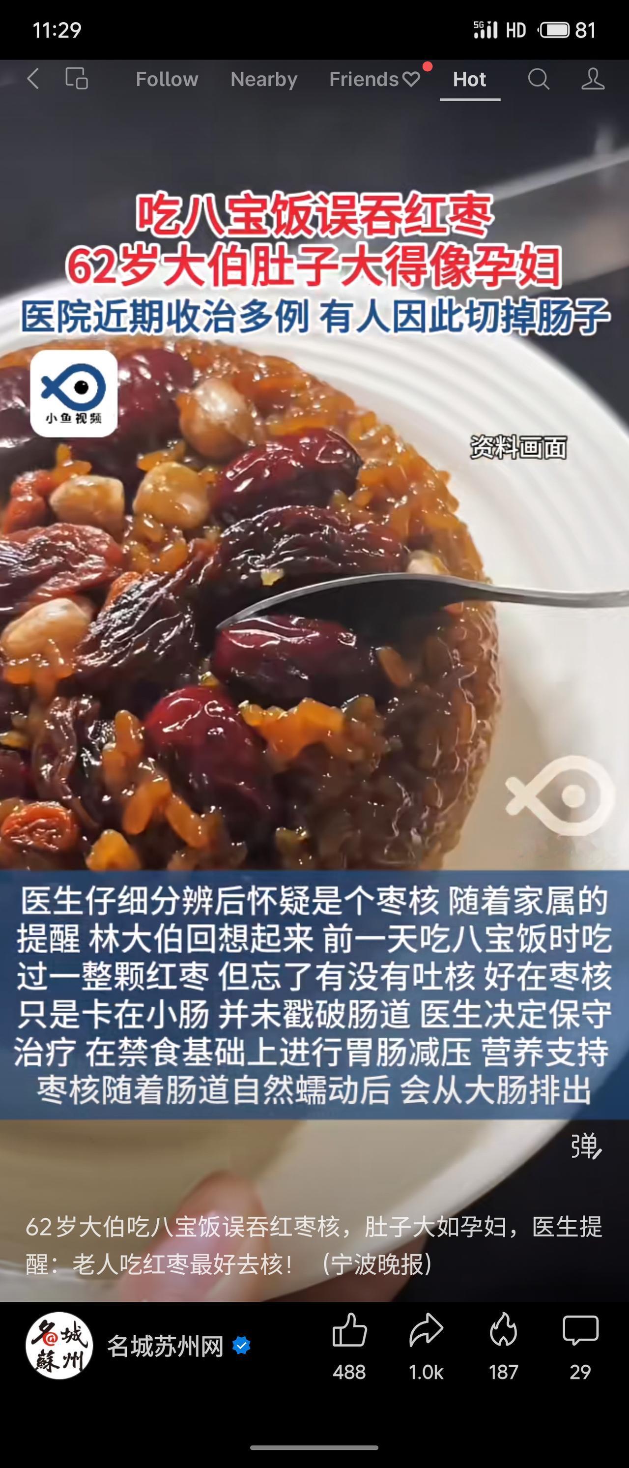 宁波62岁林大伯吃八宝饭误吞枣核,腹痛腹胀如孕,CT显示枣核卡在小肠致肠梗阻。因未戳破肠壁,经保守治疗后排出。医院近期收治多例,有患者需手术切肠。 枣核尖锐难消化,老人吞咽反射弱易误吞,嵌顿后风险极高。案例警示:节日饮食需细心,给老人吃红枣最好先去核。看似小事,却可能引发严重外科急症,关乎生命健康。