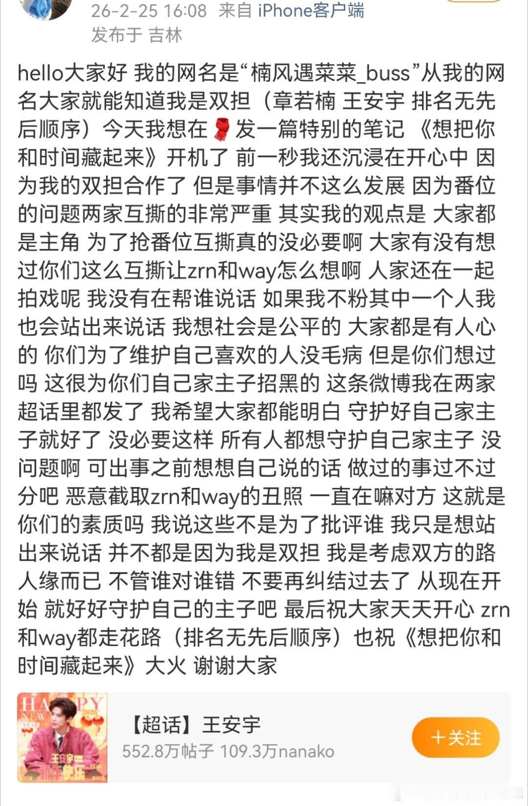 也有两人cpf跑到王安宇个人超话劝架,但是全程没有标点符号,说话条理不清晰,劝架无效。但是居然没被屏蔽,这还蛮牛的,啥时候cpf能跑个超说话了?