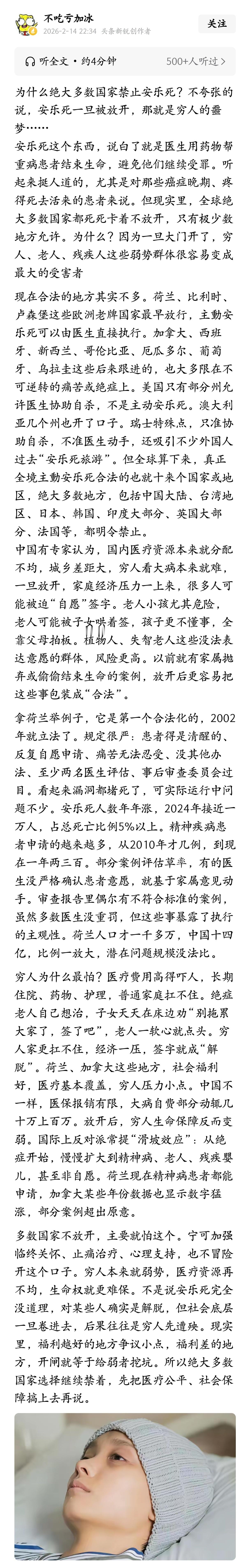 为什么绝大多数国家禁止安乐死?因为安乐死一旦被放开,那就是穷人的噩梦。