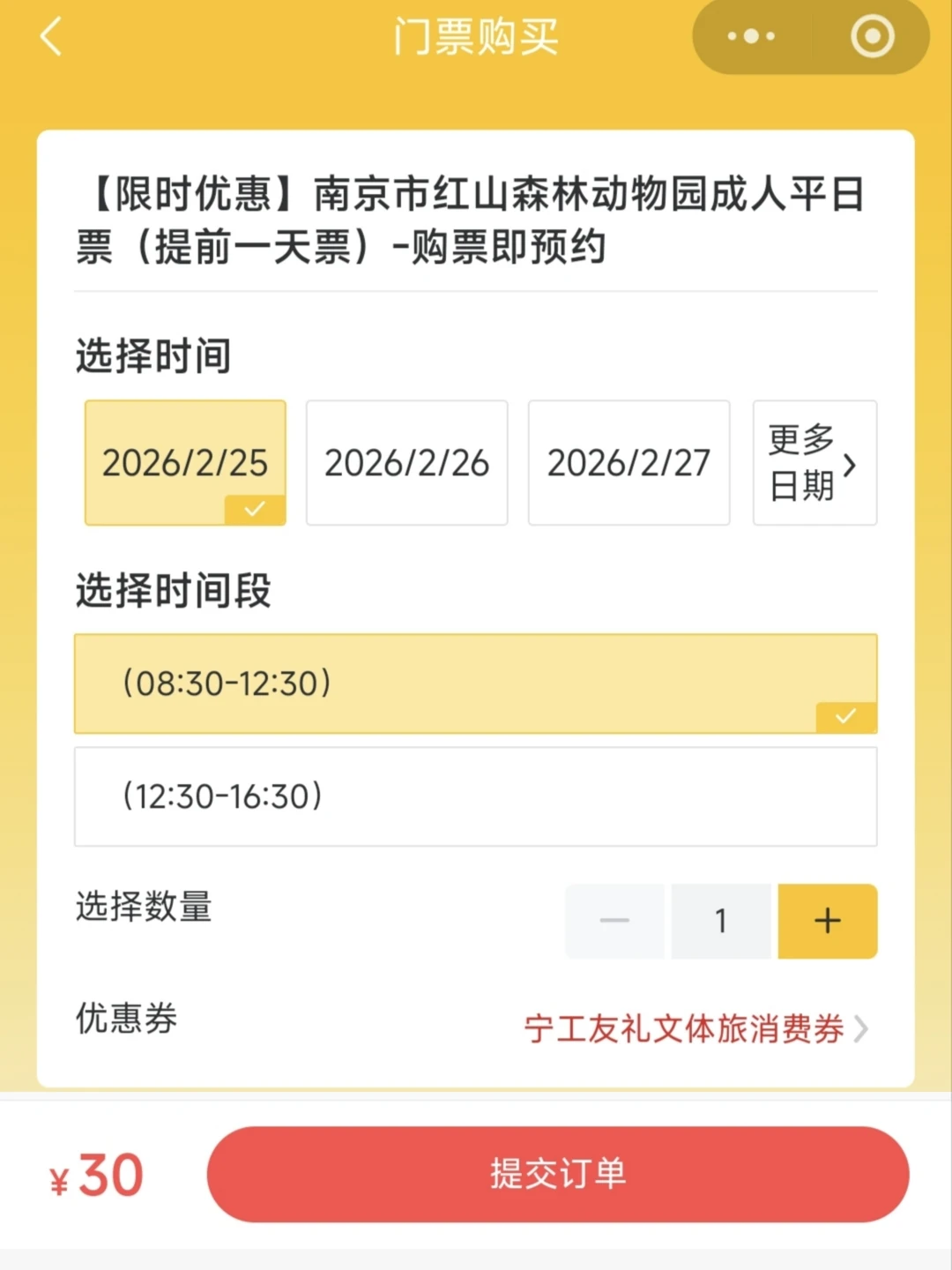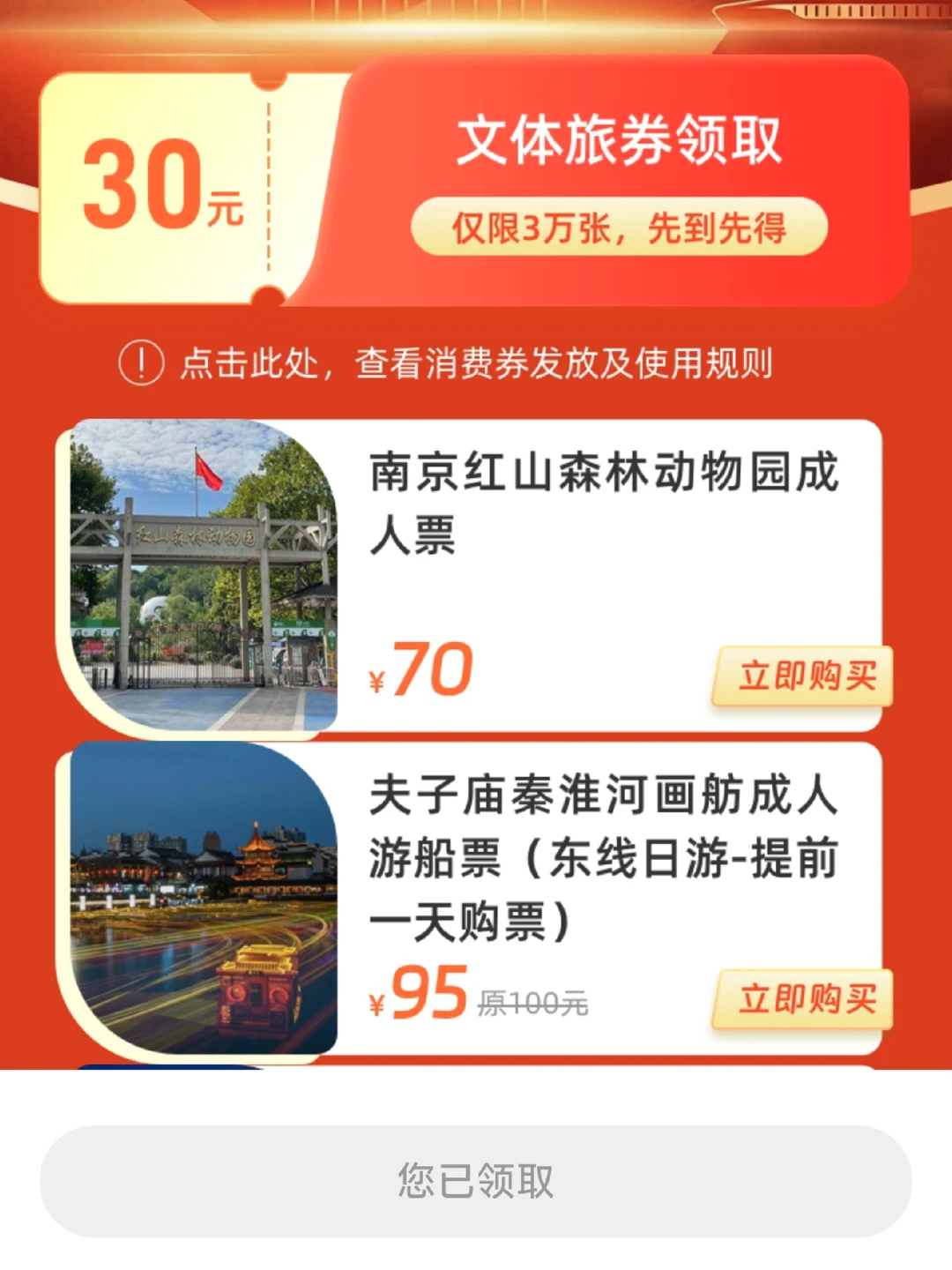 🎫活动分三轮总计发放3万张,目前还有2万张;红山动物园、夫子庙游船、大报恩寺门票立减30元,以红山动物园为例,提前购票60元券后门票仅需30元!当天购票70元券后门票40元~