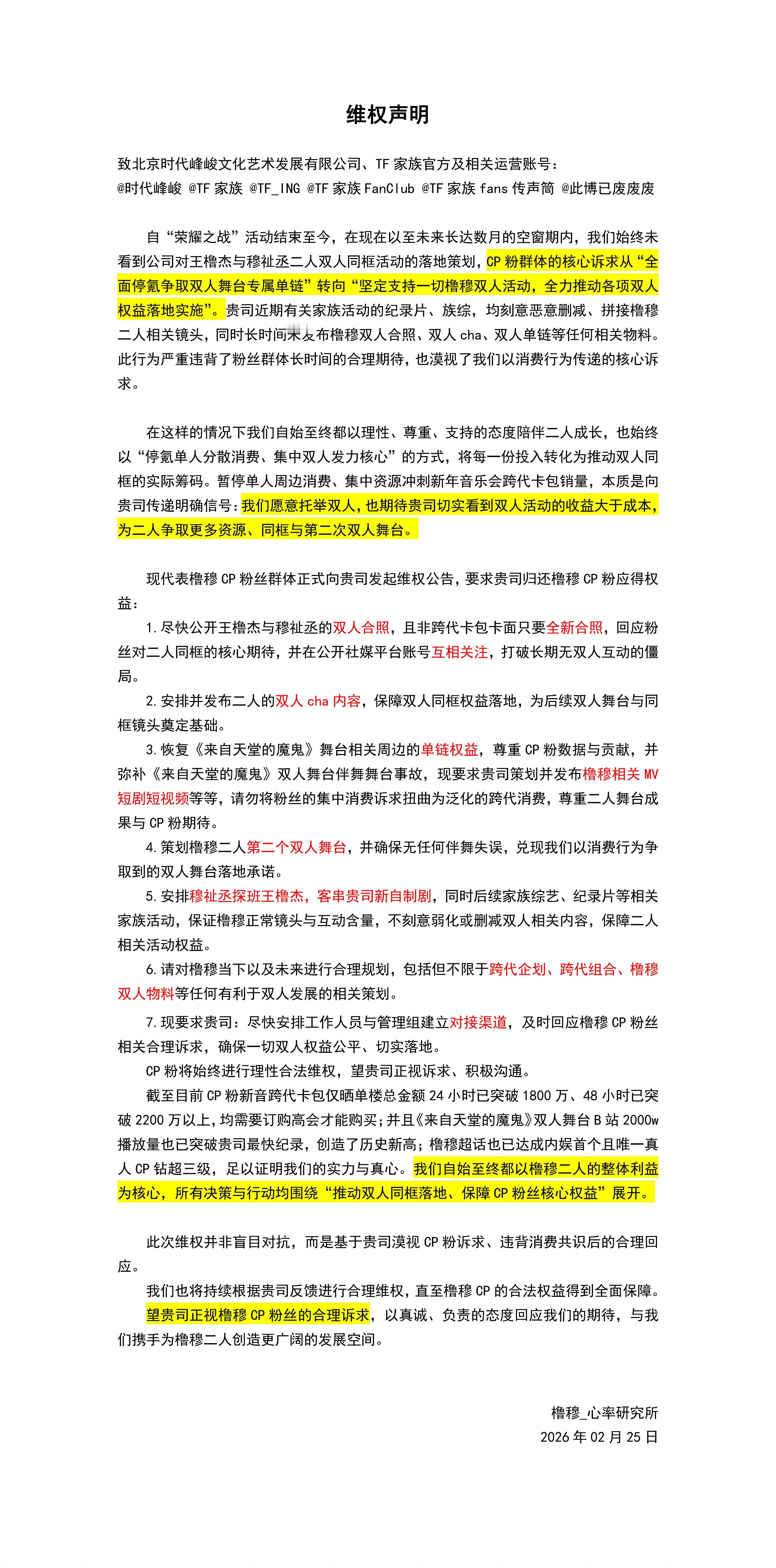 橹穆CP粉维权声明 橹穆粉丝发布维权声明,没有任何官方预热,3小时内就已超4.3w人晒单,2200w说掏就掏,内娱美帝的排面!时代峰峻你想要的橹穆随手就给了,那橹穆cp粉想要的你什么时候抬上来?橹穆cp粉发布维权声明