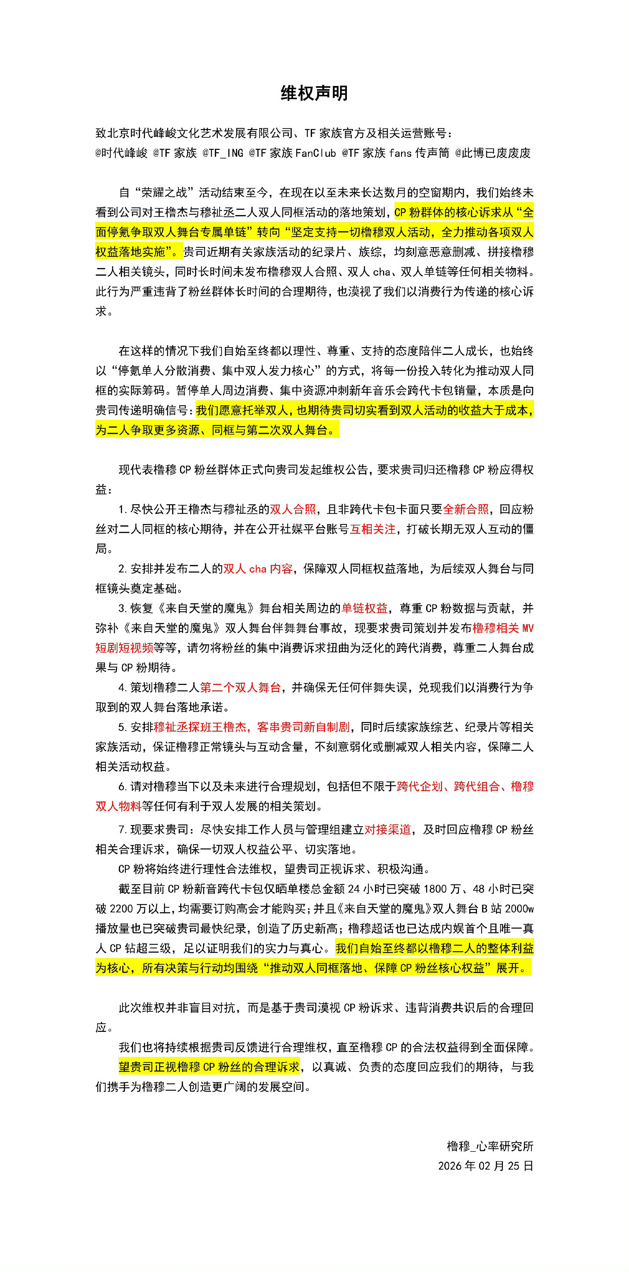 橹穆粉丝发布维权声明公开双人合照,安排并发布二人的双人 cha 内容,恢复双人舞台相关周边的单链,策划橹穆二人第二个双人舞台!