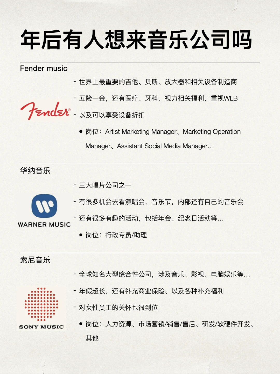 音乐外企真的很适合女生,氛围轻松、有创造力,日常工作也会比传统行业更有趣,日常接触的就是唱片、艺人、音乐内容、演出项目 节奏松弛,基本 955,年假12-15天,有时候还能去参加一些活动。很适合对音乐、传媒这方面感兴趣的 岗位机会也很多,包括内容、运营、宣传、公关、艺人项目、市场、品牌、设计、版权管理…团队创意感很强,工作体验会比传统行业有趣很多 坚持日更✊🏻,对外企感兴趣的欢迎常来看看
