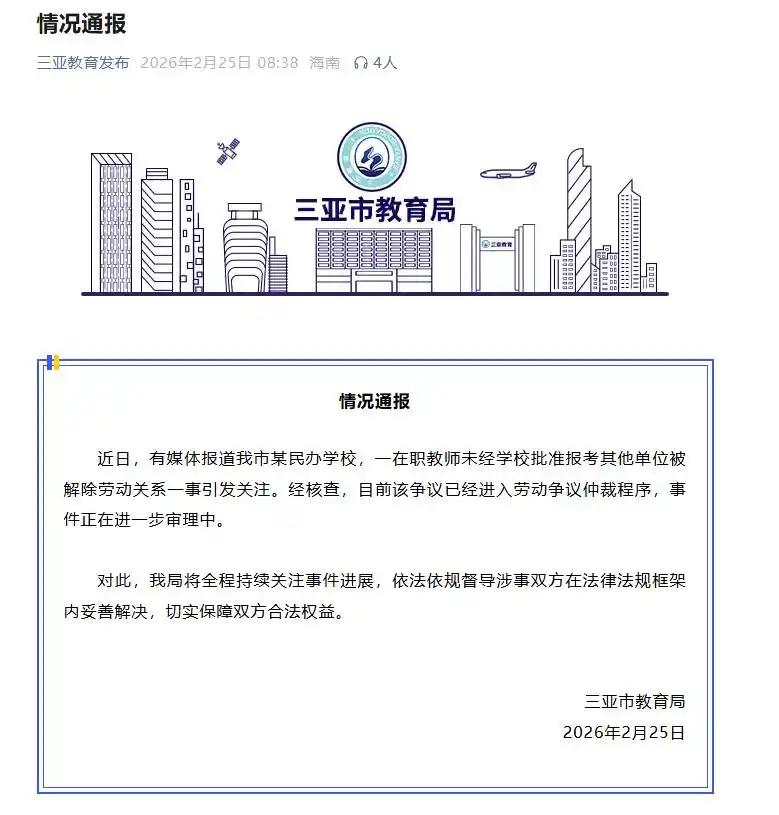 离谱! 2.25教师考编被开除,职场选择权被粗暴践踏 据三亚教育局、微博、今日头条2月25日最新通报,三亚一民办教师入职两个多月,报考其他单位未获批,直接被学校开除,现已走劳动仲裁。 这事看着是学校管员工,实则是把打工人当私有财产。 签了劳动合同就不能找退路?上班是卖身吗? 民办学校留不住人不从待遇找原因,只会用开除堵路,越管越跑。 职场最扎心的真相:你想多一条出路,老板想断你所有退路。 这事必须掰扯清楚,要么尊重择业权,要么别搞霸王条款,打工人不该被拿捏!