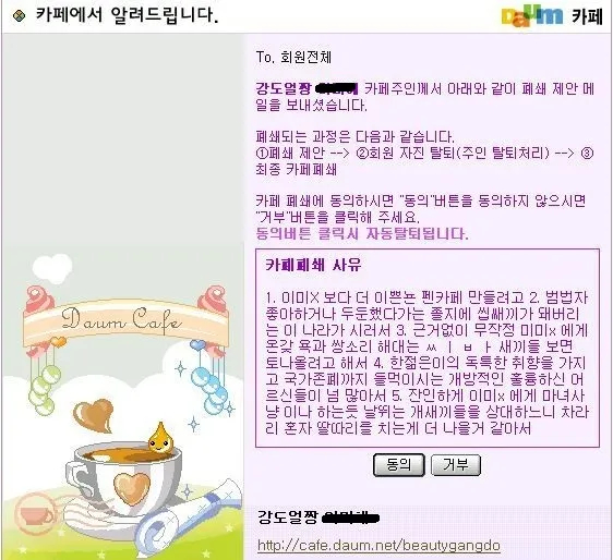 李美惠的粉丝俱乐部在民众们的抗议下最终关停,俱乐部管理员在关停时发布了一篇充满戾气的公告: ★ 俱乐部关闭理由 ★ 想去建一个比李美惠更漂亮的爱豆的粉丝俱乐部。 只要喜欢或偏袒一下罪犯,立马就会被骂成“狗崽子”/“混账”,我讨厌这个国家。 看到那群毫无根据就对李美惠疯狂辱骂、满嘴脏话的西八崽子们,我就想吐。 那种因为一个年轻人的独特品味,就上升到国家存亡高度的“开明且伟大”的老古板实在是太多了。 与其去搭理那群残忍地对李美惠进行魔女狩猎、上蹿下跳的狗崽子,还不如自己一个人躲起来撸管。