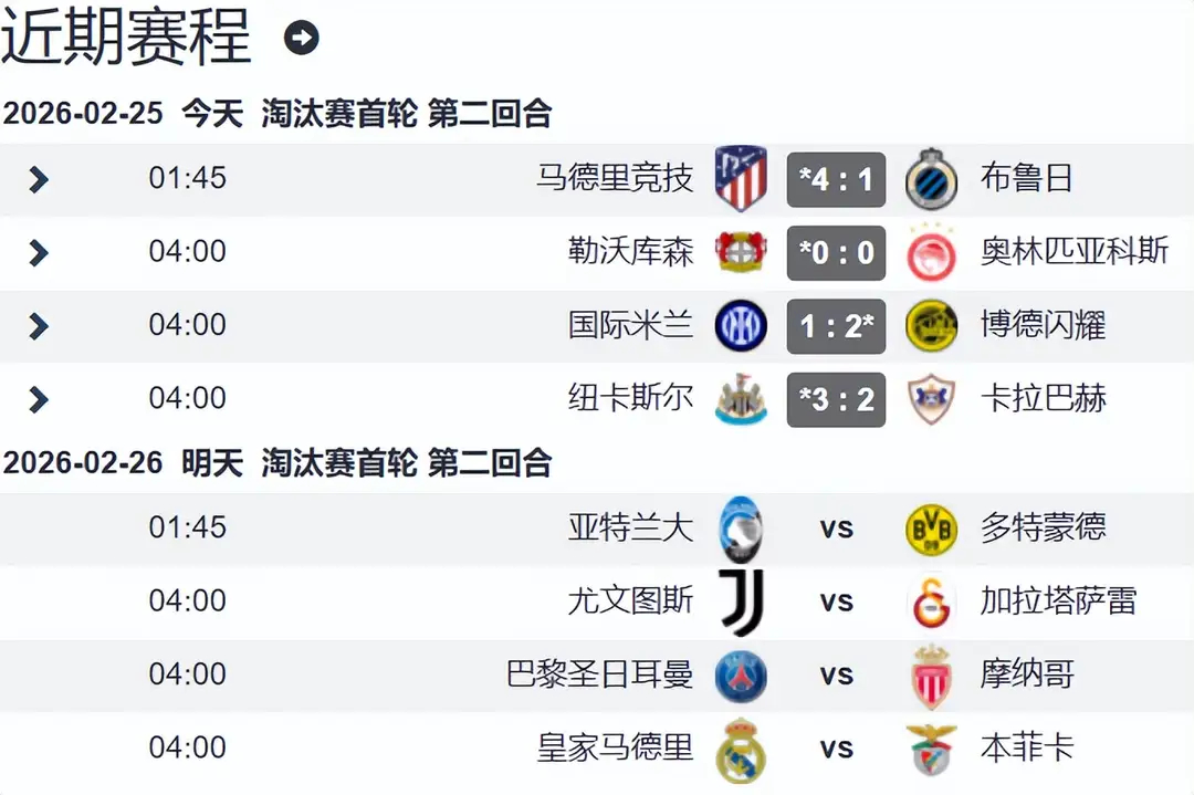 一夜4场欧冠 意甲领头羊被弱旅双杀出局 马竞大胜晋级 英超6队团聚欧冠1/8决赛附加赛次回合的比赛在北京时间2月25日凌晨战罢4场,结果真是让球迷大跌眼镜,其中意甲联赛颜面扫地,领头羊国际米兰被非五大联赛弱队双杀出局;马竞大胜晋级,挪威大中锋瑟尔洛特上演了帽子戏法;纽卡斯尔双杀弱旅晋级,英超6队齐聚欧冠1/8决赛,第一联赛战力真是名不虚传;勒沃库森0-0闷平,总比分2-0弱旅晋级。欧冠1/8决赛附加赛次回合4场战况如下:马竞4-1布鲁日,首回合3-3战平,马竞总比分7-4晋级,这是五大联赛强队应有的战力。勒沃库森0-0奥林匹亚科斯,首回合勒沃库森客场2-0取胜,药厂算是按部就班晋级。国际米兰1-2博德闪耀,意甲领头羊真是没有面子,客场由于人工草的原因输球可以理解,回到梅阿查主场,国际米兰再一次输给博德闪耀,总比分2-5被双杀,蓝黑军团以最窝囊的方式出局,真是颜面扫地。随着国际米兰出局,意甲球队有可能团灭,因为首回合另外两支意甲球队都输球了,亚特兰大客场0-2不敌多特蒙德,尤文图斯客场2-5惨败给加拉塔萨雷,两队次回合逆转的可能性都不大,加上欧冠前八没有意甲球队,欧冠16强大概率会没有意甲球队。纽卡斯尔3-2总比分9-3双杀卡拉巴赫晋级欧冠16强,英超6队携手征战欧冠1/8决赛。此役,实际上纽卡斯尔对阵容进行了大轮换,但依然击败对手轻松晋级。英超6队踢欧冠淘汰赛,与意甲面临团队的糟糕局面形成了鲜明的对比。