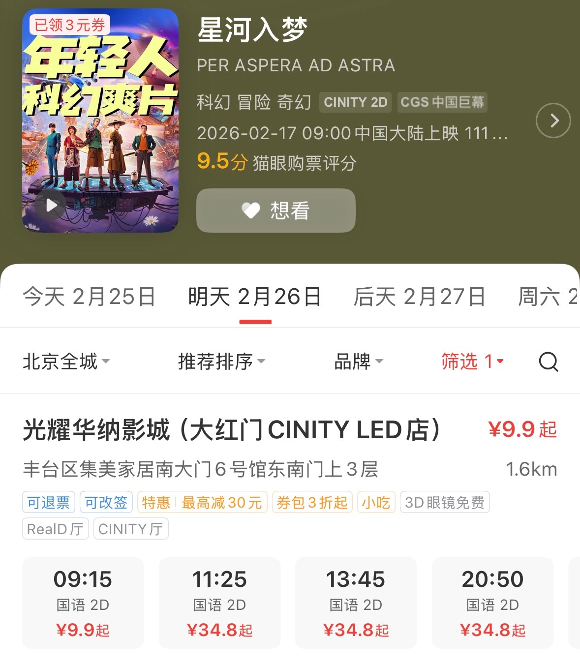 前两天刚呼吁过局里应该有些举措助力下《星河入梦》,这两天就看到发力了,中影自营的CINITY厅,也就是这次《星河入梦》发行的顶配格式开出了9.9元的特惠观影场次,但这个优惠每个账号应该只能享受一次。尽管放映的时间和地点都比较死亡,还是决定起大早去看看了,不少朋友都说C厅看片中各个梦境世界的特效比较过瘾,希望能有好一些的观影体验吧。春节档马上有戏春节档影评大赛