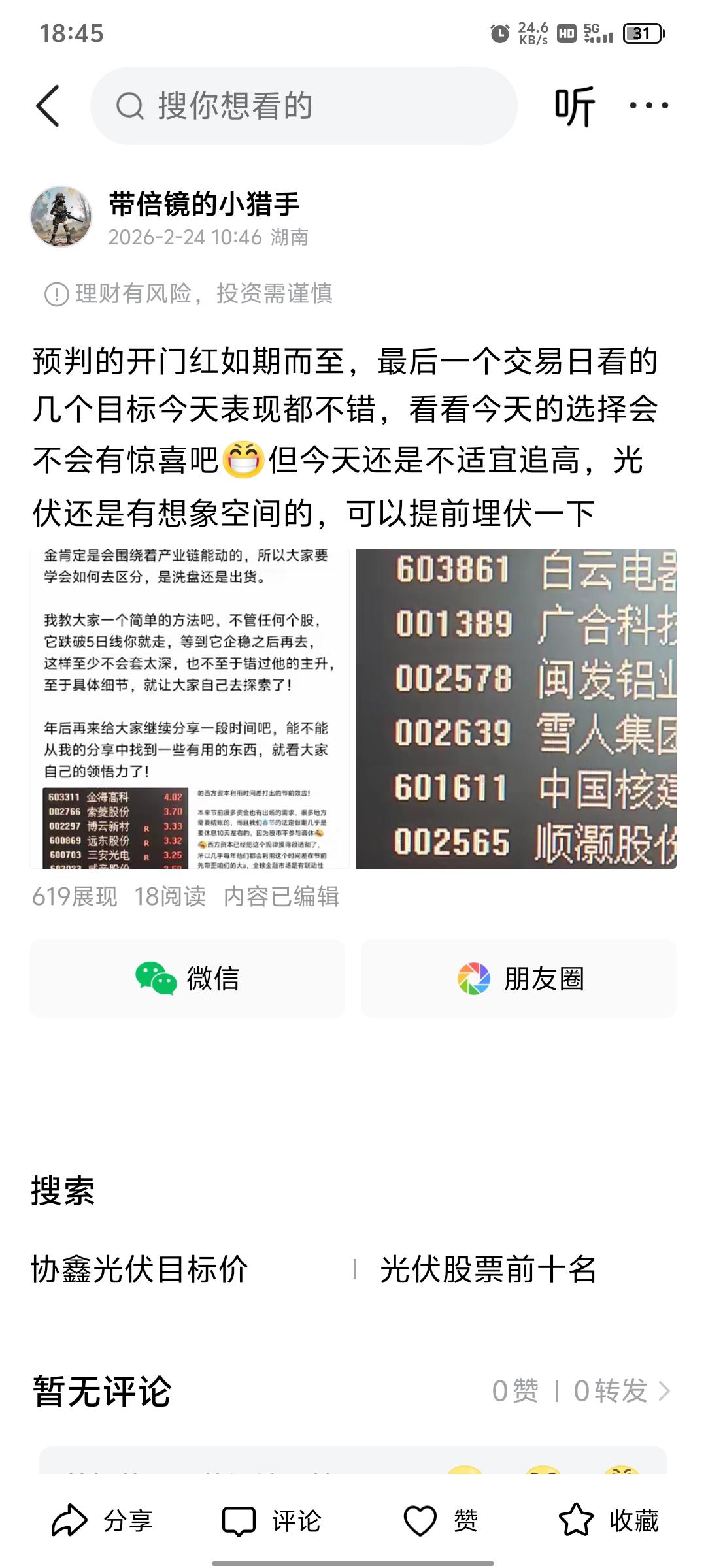 年前说了给大家送点开门红,所以这几天陆续分享了一些个人的看法,理论上应该没让大家失望[害羞]分享不是为了让大家去抄答案,而是为了让大家从我看的目标中能够更快速直观的分析出一些技巧和逻辑,从而获得在股市长久生存的根本! 但如果继续分享,又会让大家形成依赖性,所以又到了要隐身的时候了,下一个重大节日我再来继续给大家帮点小忙[害羞] 没基础的朋友可以去看一下我那篇公众号上的散户文章,相信一定能给你带来一些提示!