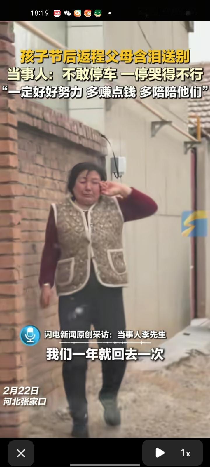 2月22日,河北张家口。一段父母含泪送别的视频走红网络,视频收获了百万点赞。视频中,年味尚未散去,子女们都回浙江工作,父母含泪送别,场面让人泪目。 当事人李先生表示,我们一年就回去一次,我爸妈送我们走的时候,我们都会哭。不敢停车,一停就哭得不行,出来以后一定要好好努力,多赚点钱,多陪陪他们