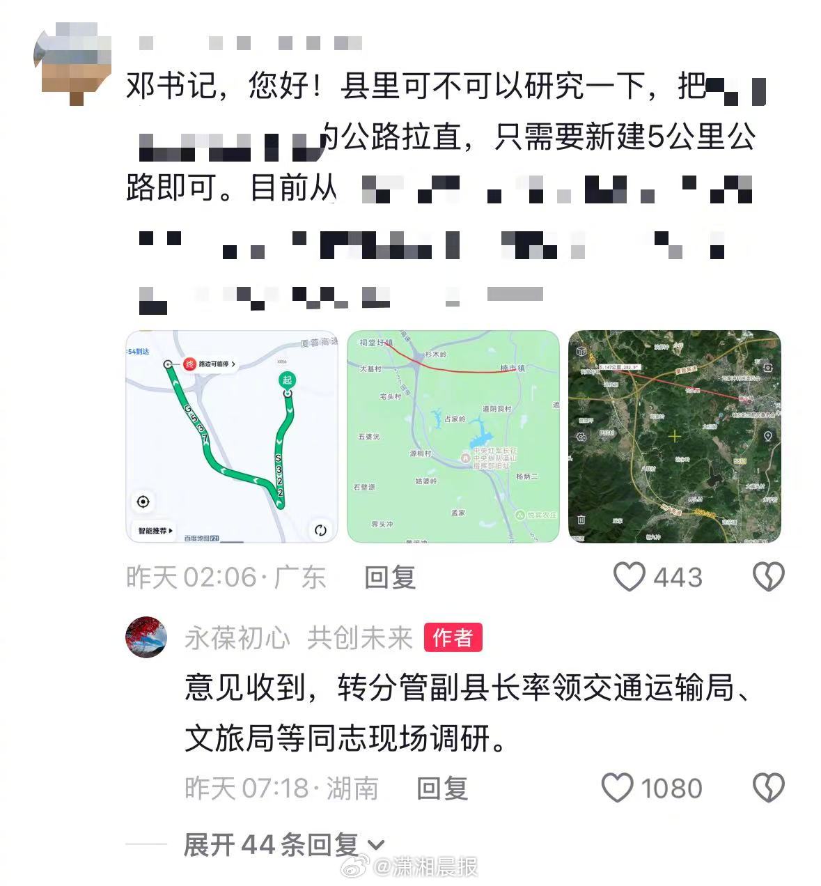 而被网友们称为“邓书记”的账号作者对每条留言都耐心回复,并直接给出处理方案,如“信息收到,已安排祠堂圩镇党委书记核查处理。”“收到信息,已派城管局长前往现场调研处置。”有网友在评论区指出,这个名为“永葆初心 共创未来”的账号使用者,正是永州市蓝山县委书记邓群本人。