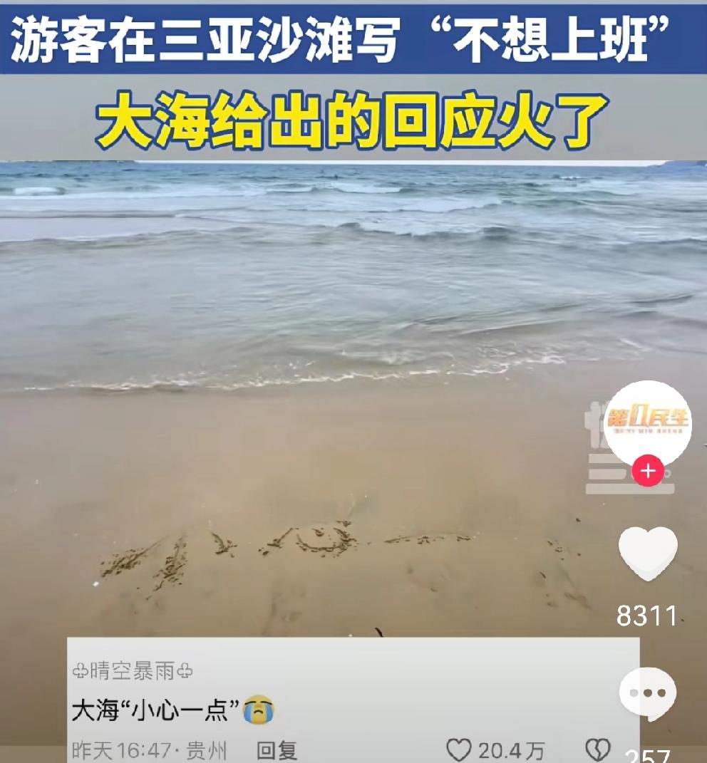 大海的回应,太智慧了! 游客春节去三亚游玩,长达9天的假期就要结束了。游客意犹未尽。 临走时漫步海边,在三亚沙滩上写了“不想上班”四个大字,表达此时此刻的心情。 结果,海浪涌上沙滩,冲刷着四个大字。最后,留下“小心一点”四个大字! 似乎在提醒游客: 如果,你“不想上班”,就要“小心一点”,老板开除你,老婆休了你,老爸要骂你,老妈不高兴…… 哈哈,还是大海最懂社会,最智慧[赞] 三亚