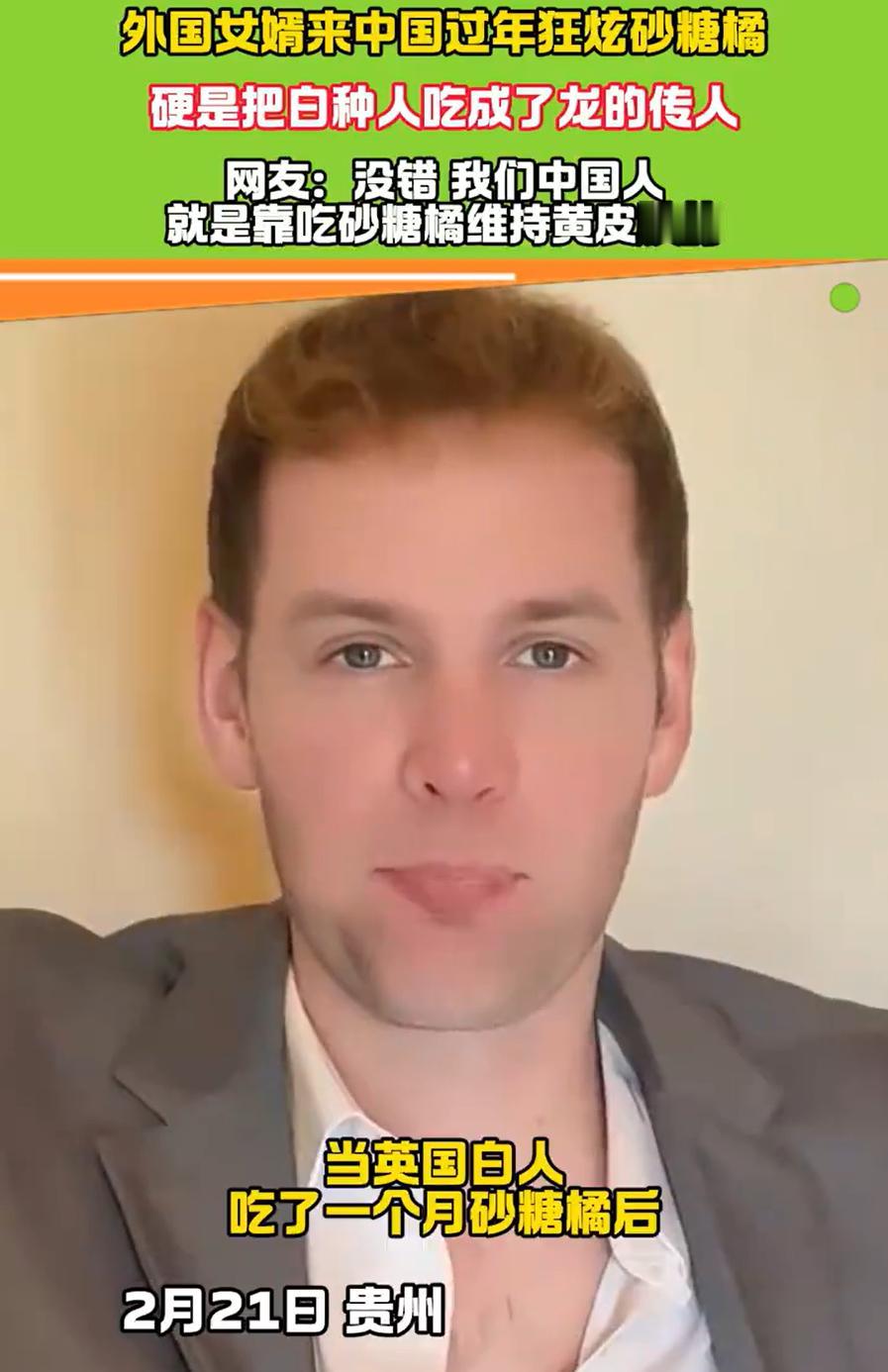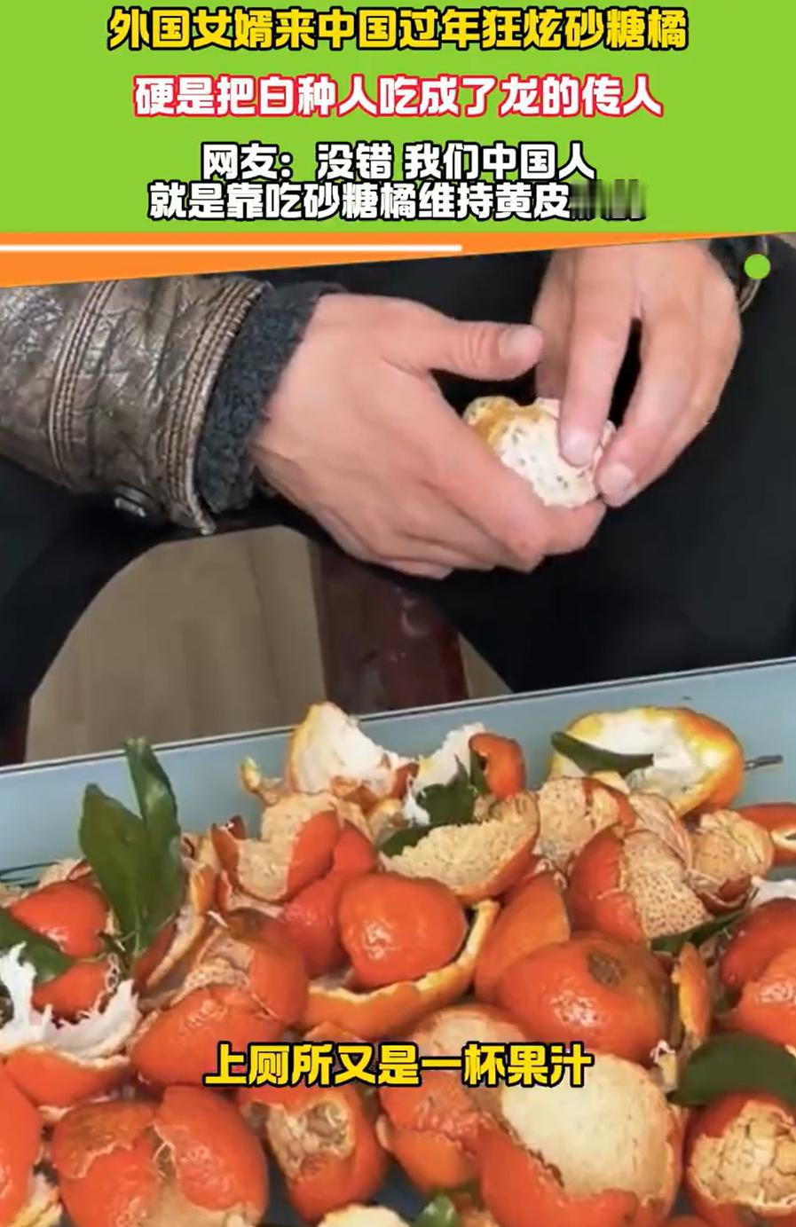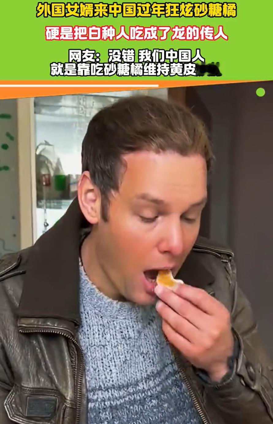 这下解释不清了!贵州,一位洋女婿跟着妻子在娘家过年,期间吃了几个砂糖橘后便一发不可收拾,万万没想到,吃了一个月后,原本的白种人硬是吃出了“龙的传人”的黄皮肤 这位来自英国的老兄,在丈母娘家头一次见识到了砂糖橘的威力。一开始也就是客气客气,尝了几个,谁知道这一吃就刹不住车了 那玩意个头小,皮薄,一口一个,甜得跟蜜似的,根本停不下来。据他媳妇说,这家伙后来发展到什么程度?一天三顿,砂糖橘当饭吃,早上起来先来十个开开胃,晚上看电视能剥一盆。一个月下来,保守估计,吃掉的砂糖橘能装满一辆小三轮 重点来了。一个月后,这位原本白得发光的英国绅士,照镜子时突然发现不对劲,自己的皮肤,怎么隐隐约约透出一股黄气?不是晒黑的那种黑黄,是那种从里到外透着橘子色的黄 他媳妇仔细端详了半天,笑得直拍大腿:你这哪是来过年,你这是来认祖归宗了!现在好了,出门人家都不问是不是外国女婿了,直接把他当本地人 男子自己都调侃:上厕所的时候,那颜色,简直跟没消化完的果汁一个样 其实,这事儿背后有个很简单的科学道理。砂糖橘这类水果,胡萝卜素含量特别高。短时间内大量吃,身体代谢不过来,多余的胡萝卜素就会跑进血液里,然后沉积在皮肤角质层,尤其是手掌、脚底这些地方,看起来就会发黄 医学上这叫高胡萝卜素血症,听着吓人,其实对健康没啥影响,只要停吃一段时间,皮肤颜色自然就退回去了 细想想这个事也挺有趣,有时候,一筐不起眼的砂糖橘,就能让一个外国人彻底爱上这里。毕竟,舌尖上的诱惑,谁也抵挡不住