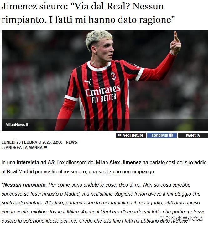 离开皇家马德里俱乐部是正确的选择,没有任何遗憾,加盟米兰是正确的选择。但被问到离开米兰的话题时,希门尼斯并没有回应,他只是露出了一个微笑。难得希门尼斯并没有对米兰表达什么,之前他离开皇家马德里和劳尔都水火不容了,当时他描述皇家马德里的词汇大部分都属于敏感词。 前米兰边路球员希门尼斯接受采访表示我不知道如果留在皇马会发生什么,但在那里的最后一年,我没有获得我认为自己应得的出场时间。最终,在与家人和经纪人商议后,我们认为前往米兰是最好的选择,我觉得一切都很顺利,我没有任何遗憾。 希门尼斯第一次代表米兰出场就挺喜欢这个孩子,一点也不怯场,敢于做动作,当然也过于想表现自己,经常玩火导致失误,但他还年轻,如果引导得当也许结果会完全不同,阿莱格里过于严苛,希门尼斯这样的性格肯定受不了阿莱格里,当然希门尼斯这样性格的球员留在米兰也不一定是啥结果,之前的米兰我们不提,今天的米兰需要铁血治军。
