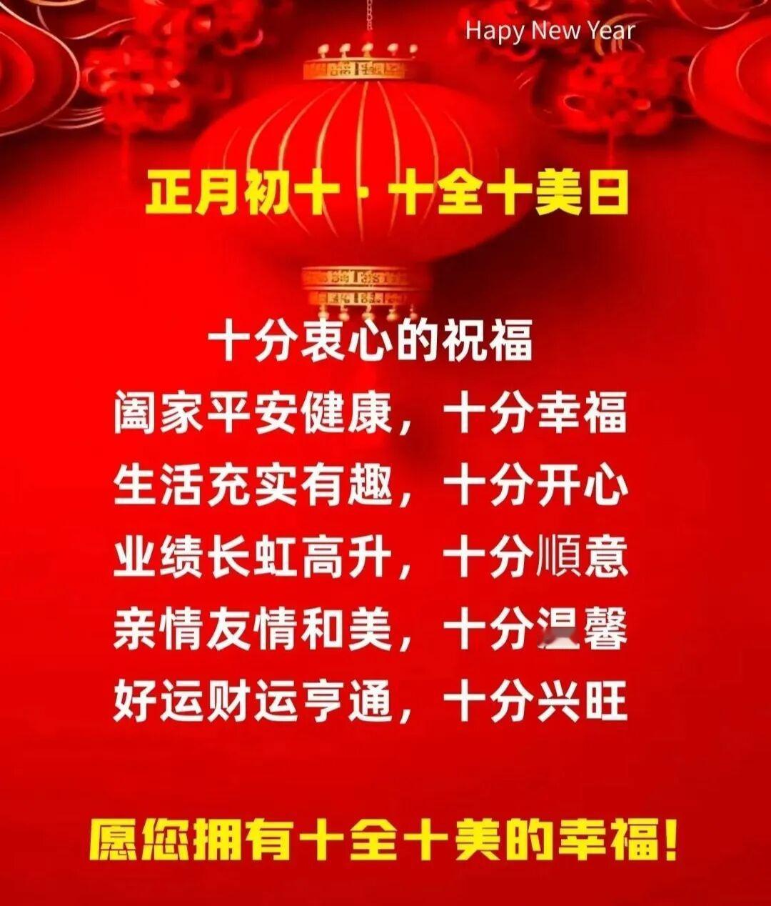 明天是马年初十 十全十美好日子 把祝福送给所有的朋友 愿你事业十拿九稳,步步高升 愿你生活十分顺心,事事如意 愿你身体健康,十分硬朗 无病无痛 愿你财运十分丰厚,盆满锅满 愿你的爱情十分甜蜜,恩爱长久 十全十美的祝福,送给十分在乎的你